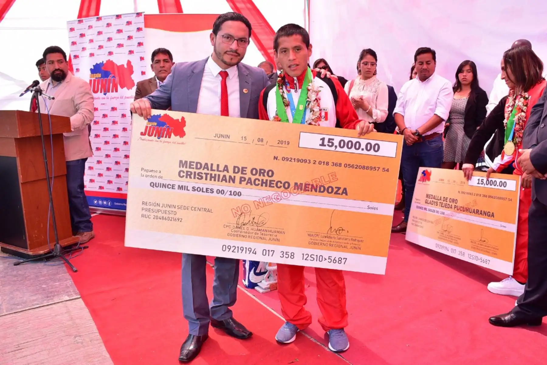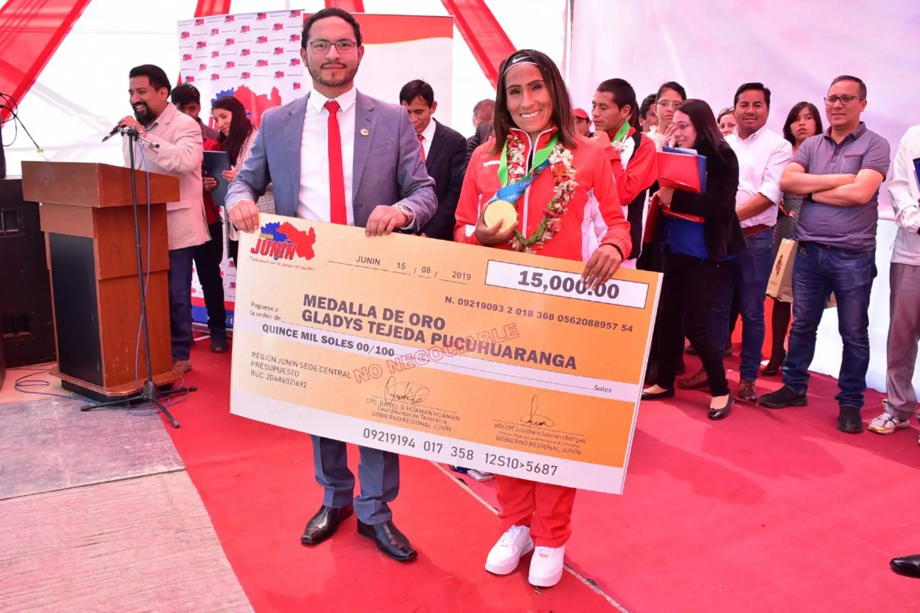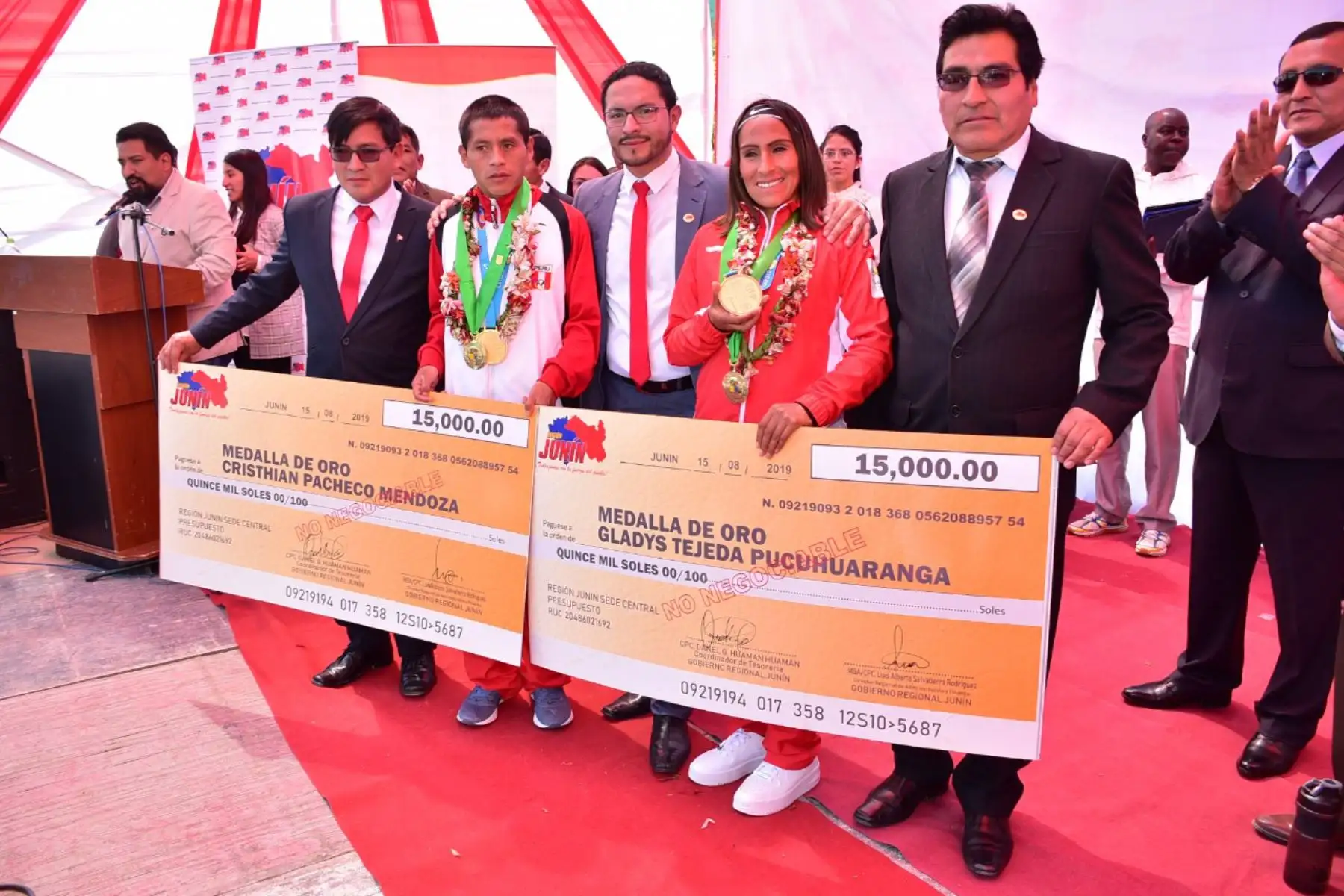 15/08/2019 Entregan Sol Libertario de Junín y varios incentivos económicos a atletas Gladys Tejeda y Christian Pacheco ganadores de medalla de oro, en los juegos panamericanos Lima 2019.Foto:ANDINA/Difusión