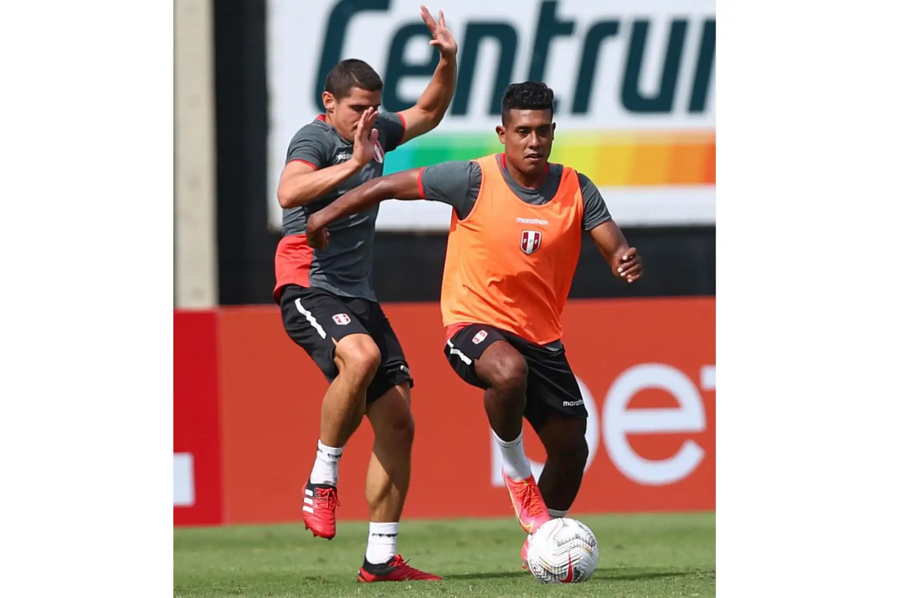 16/06/2021 La selección peruana cumplió su segundo día de entrenamiento, en la cancha auxiliar del estadio Nilton Santos de Río de Janeiro, para enfrentar mañana, a las 19:00 horas a Brasil por la fecha 2 del Grupo B de la Copa América 2021. En la imagen Cristian Ramos y Renato Tapia.