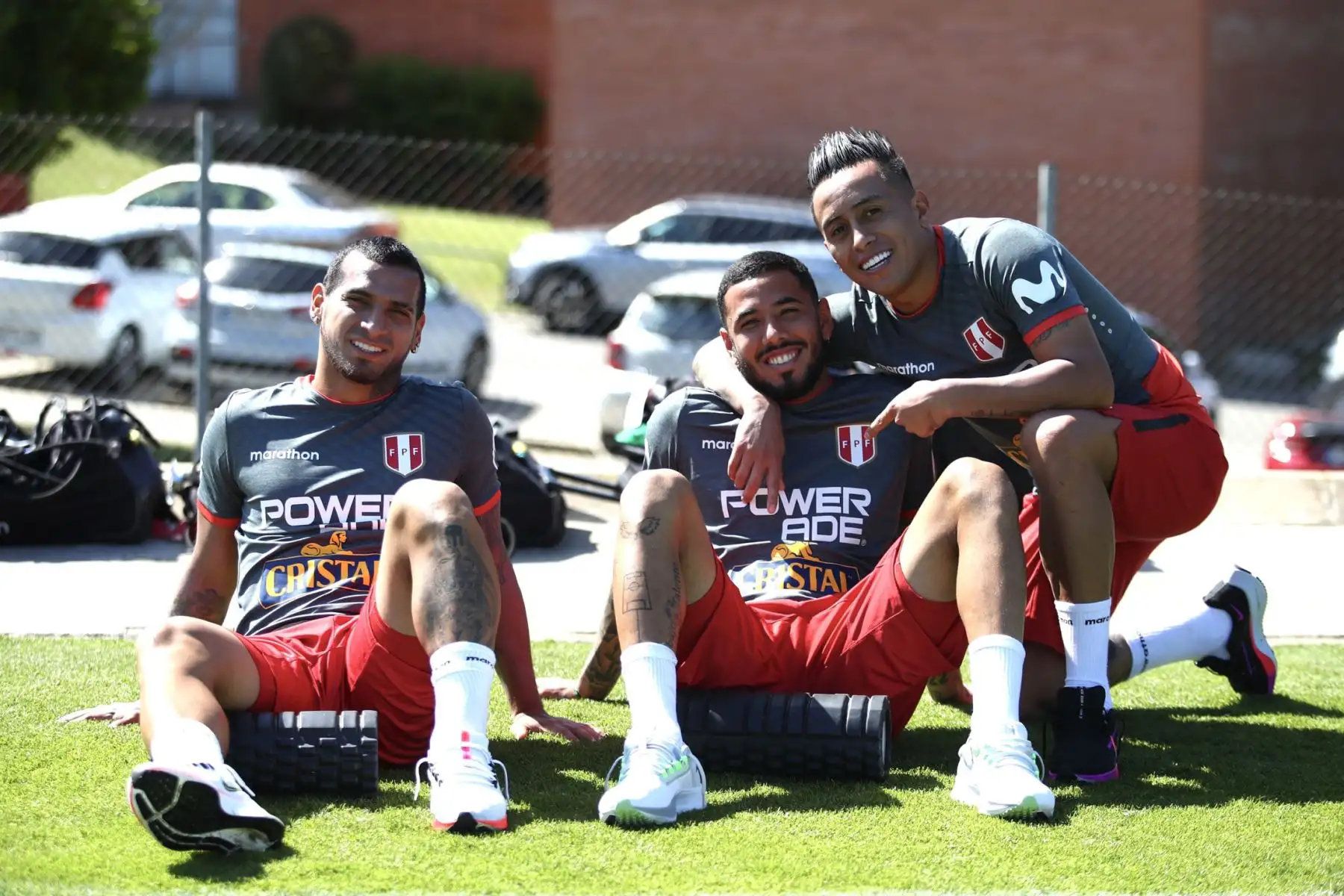 Futbolistas Miguel Trauco, Luis Abram y Christian Cueva de la selección peruana, durante el segundo día de entrenamiento en el Centro de Alto Rendimiento San Cugat de Barcelona. Foto: FPF