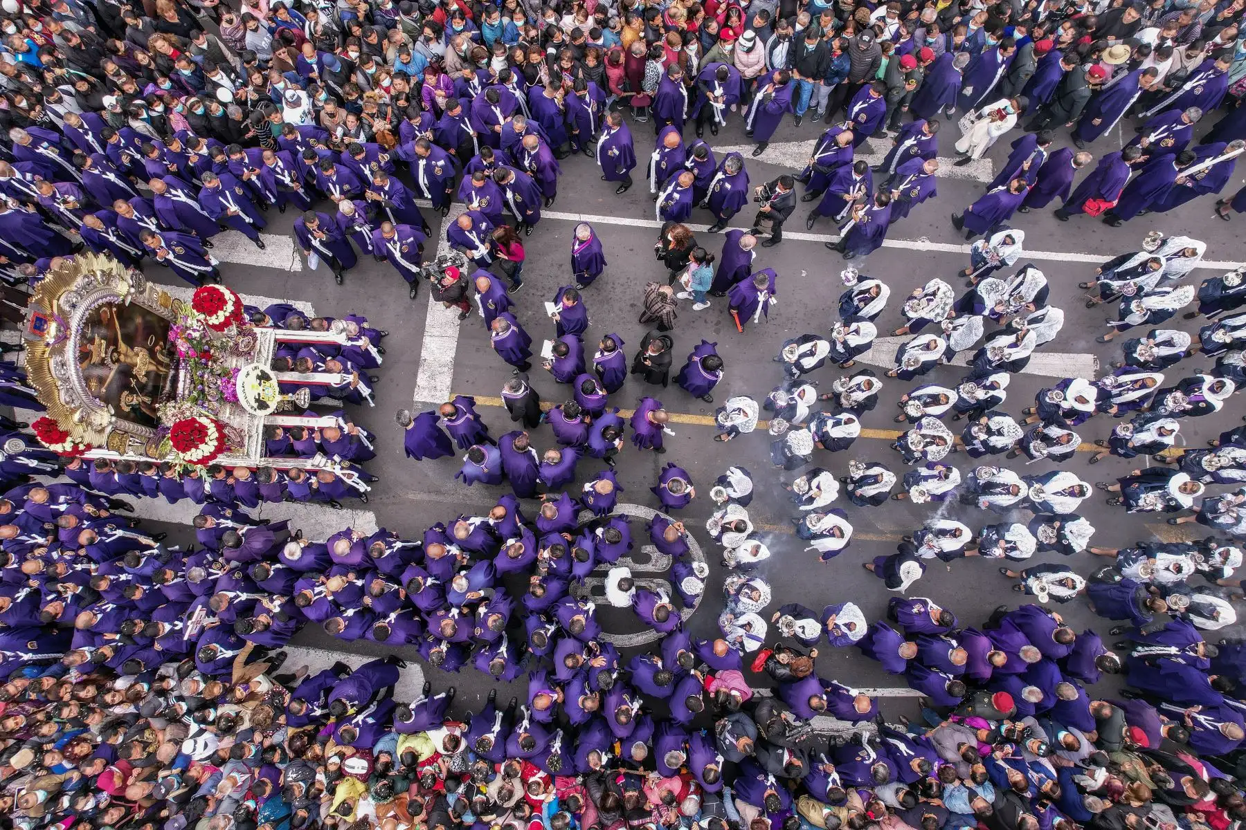 18/10/2022 Miembros de la Hermandad del Señor de los Milagros, cargan el anda con la imagen del Cristo de Pachacamilla, por las calles del centro de Lima.