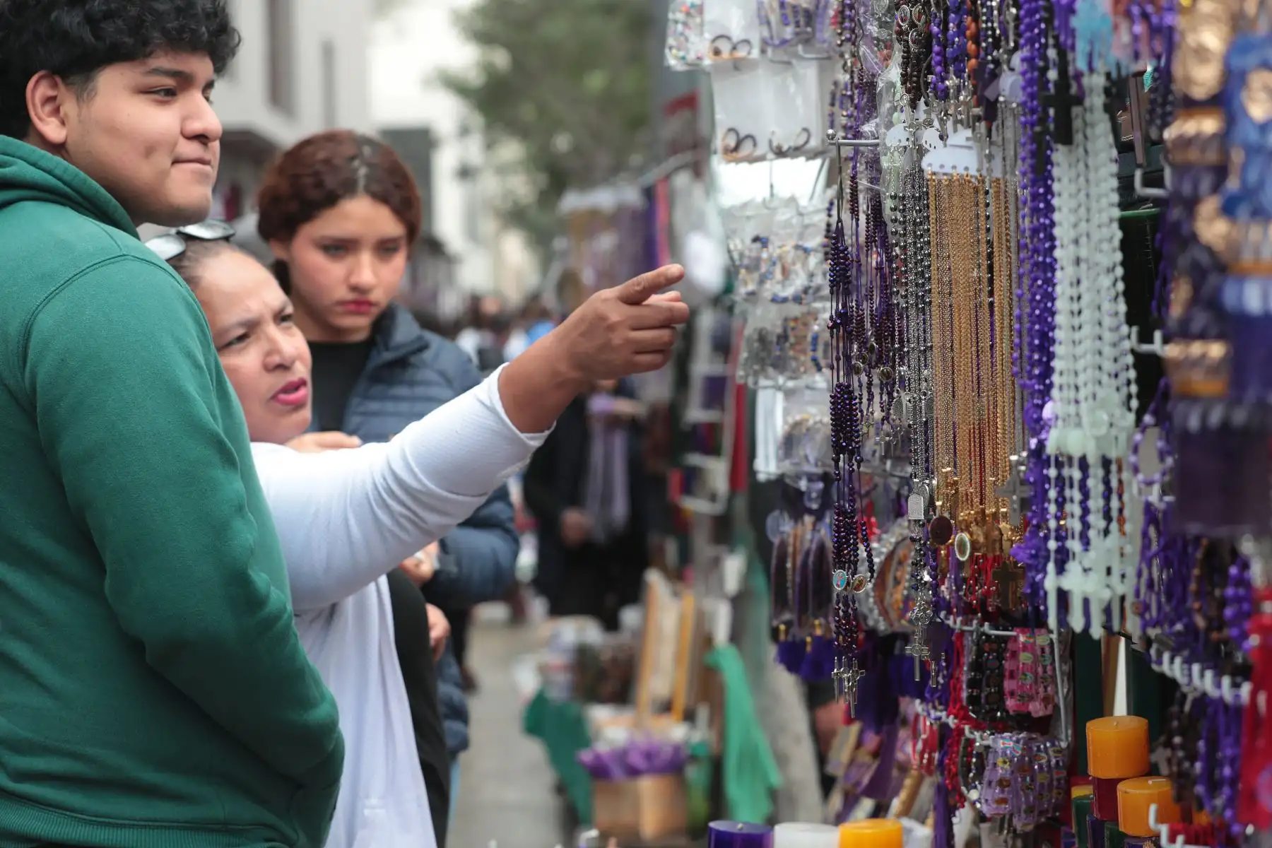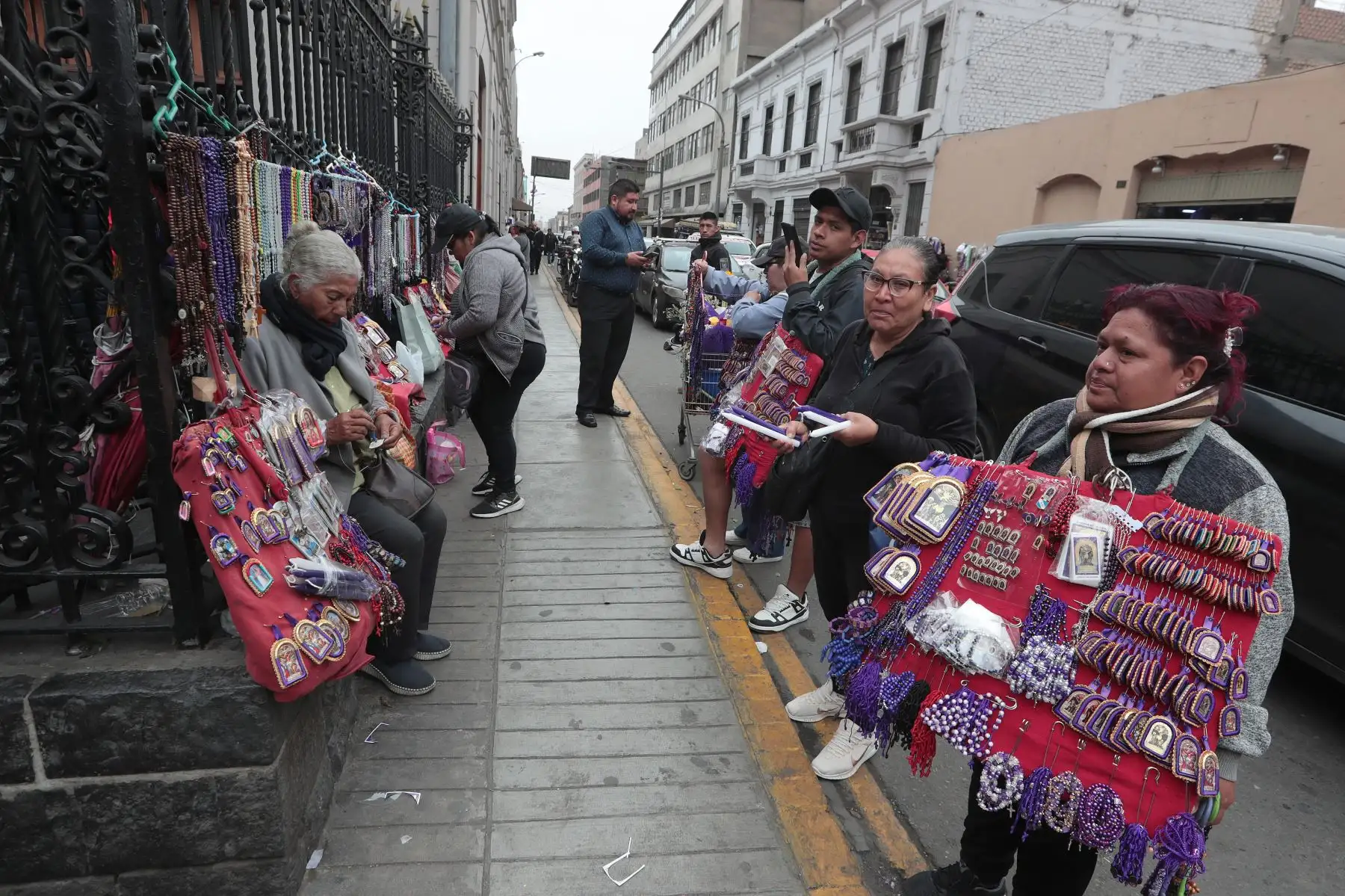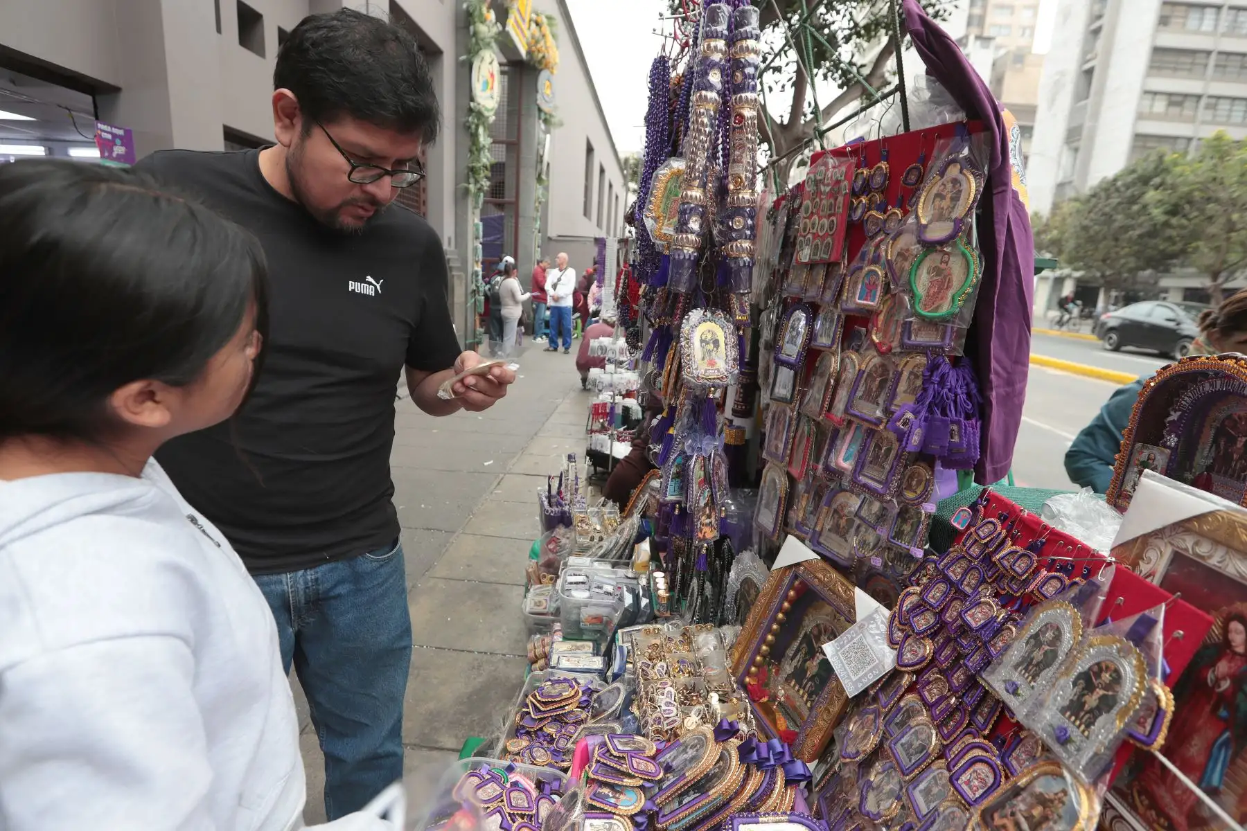05/10/2025 Vendedores, ambulantes y comerciantes ofrecen detentes, rosarios, velas, hábitos frente a la iglesia de las Nazarenas. Los fieles acuden no solo a rezar, sino también a adquirir símbolos de devoción al Señor de los Milagros.