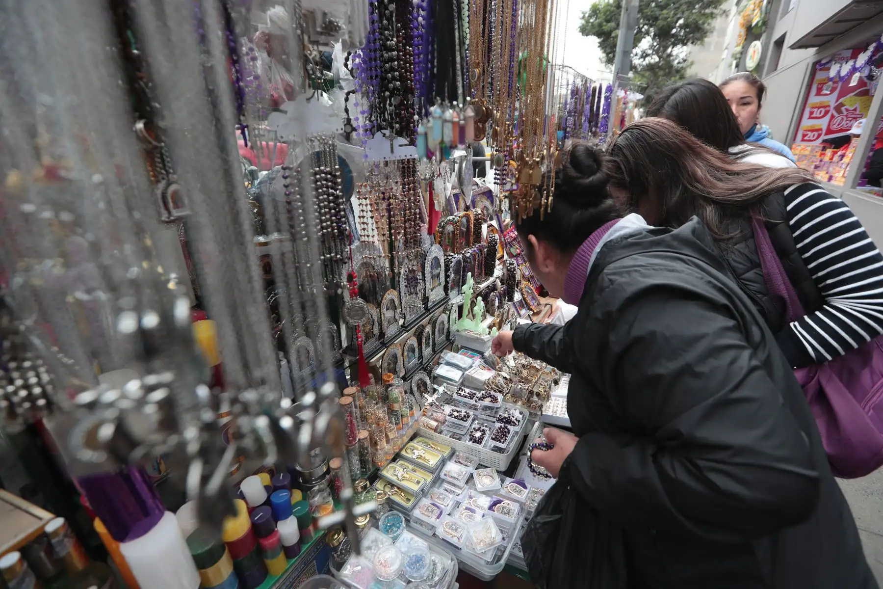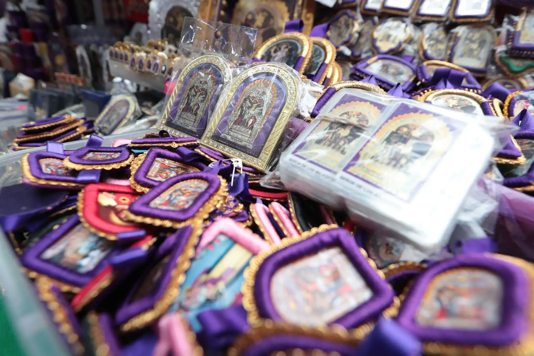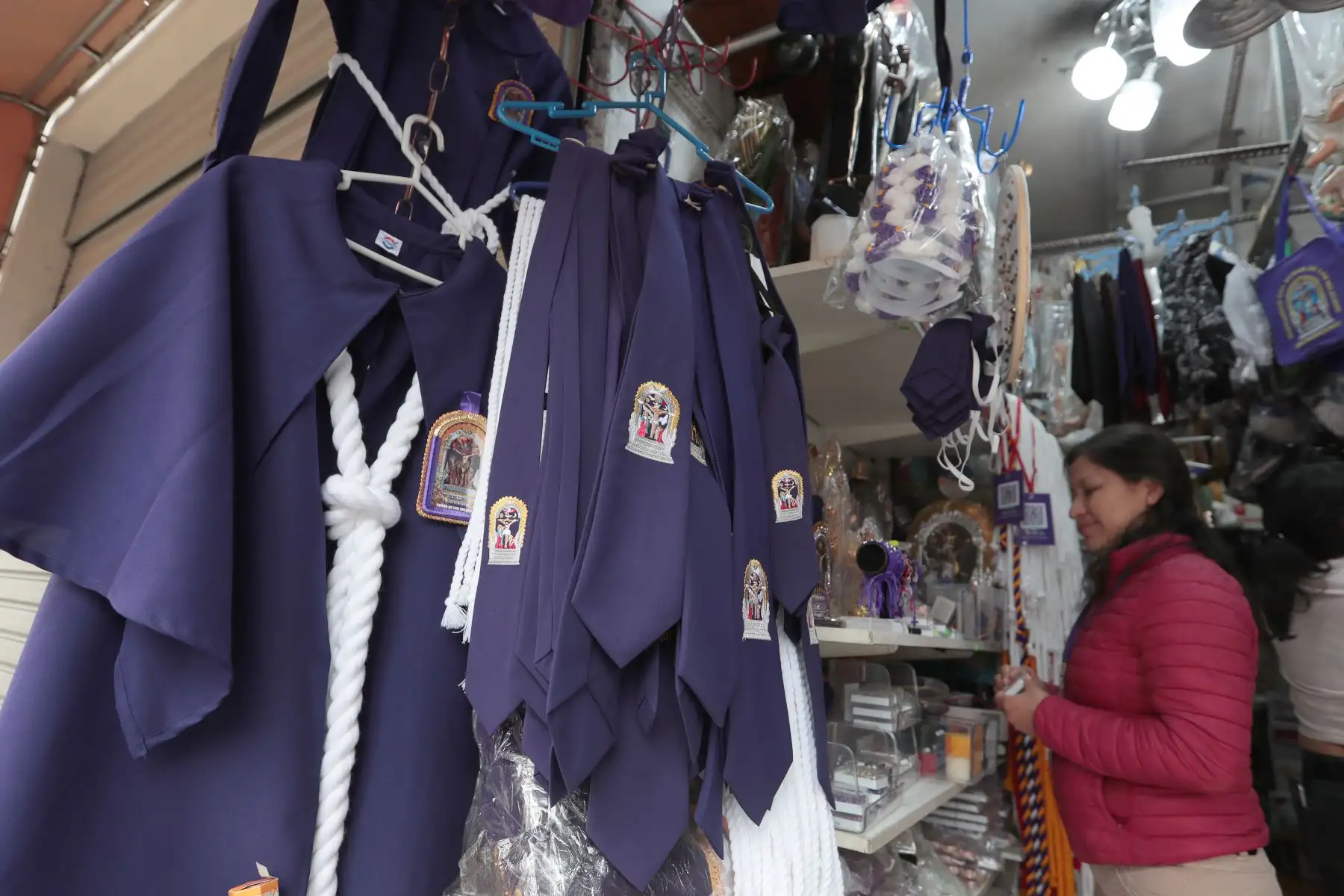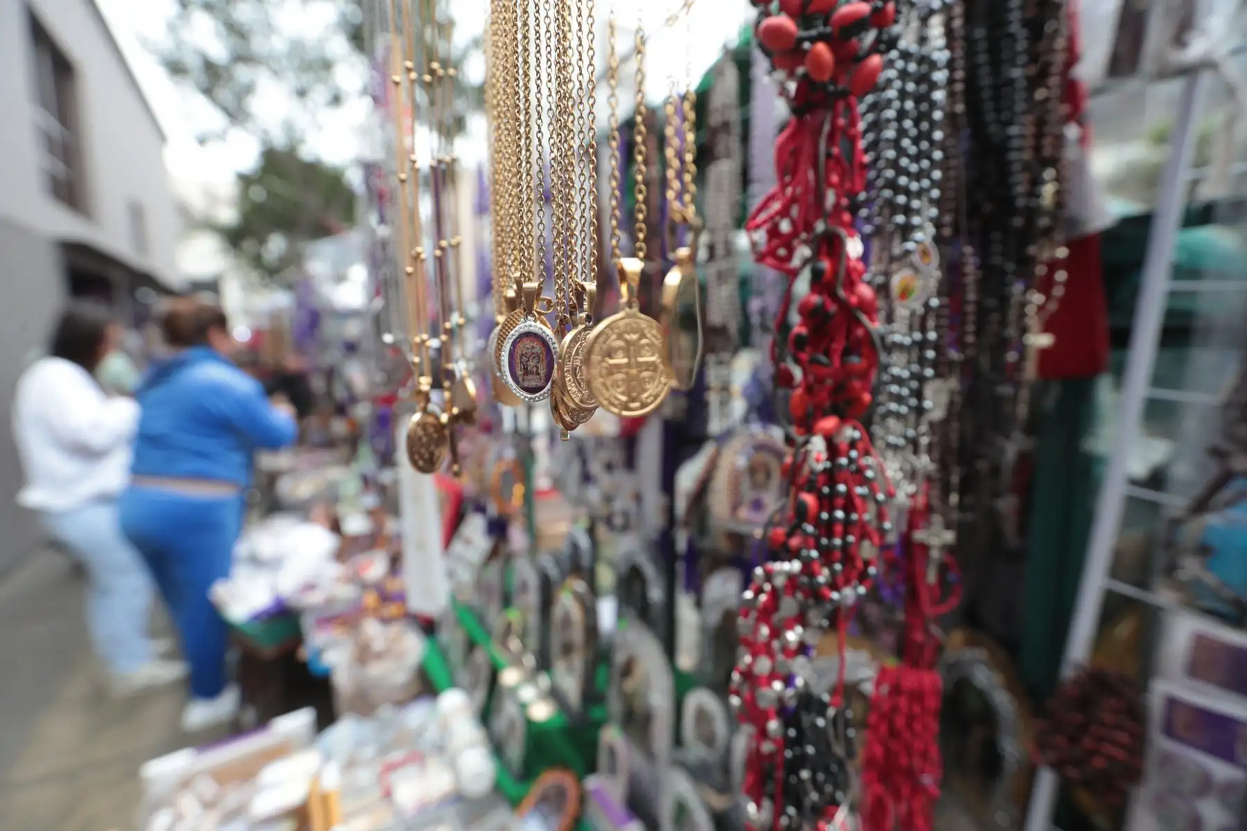 05/10/2025 Vendedores, ambulantes y comerciantes ofrecen detentes, rosarios, velas, hábitos frente a la iglesia de las Nazarenas. Los fieles acuden no solo a rezar, sino también a adquirir símbolos de devoción al Señor de los Milagros.
