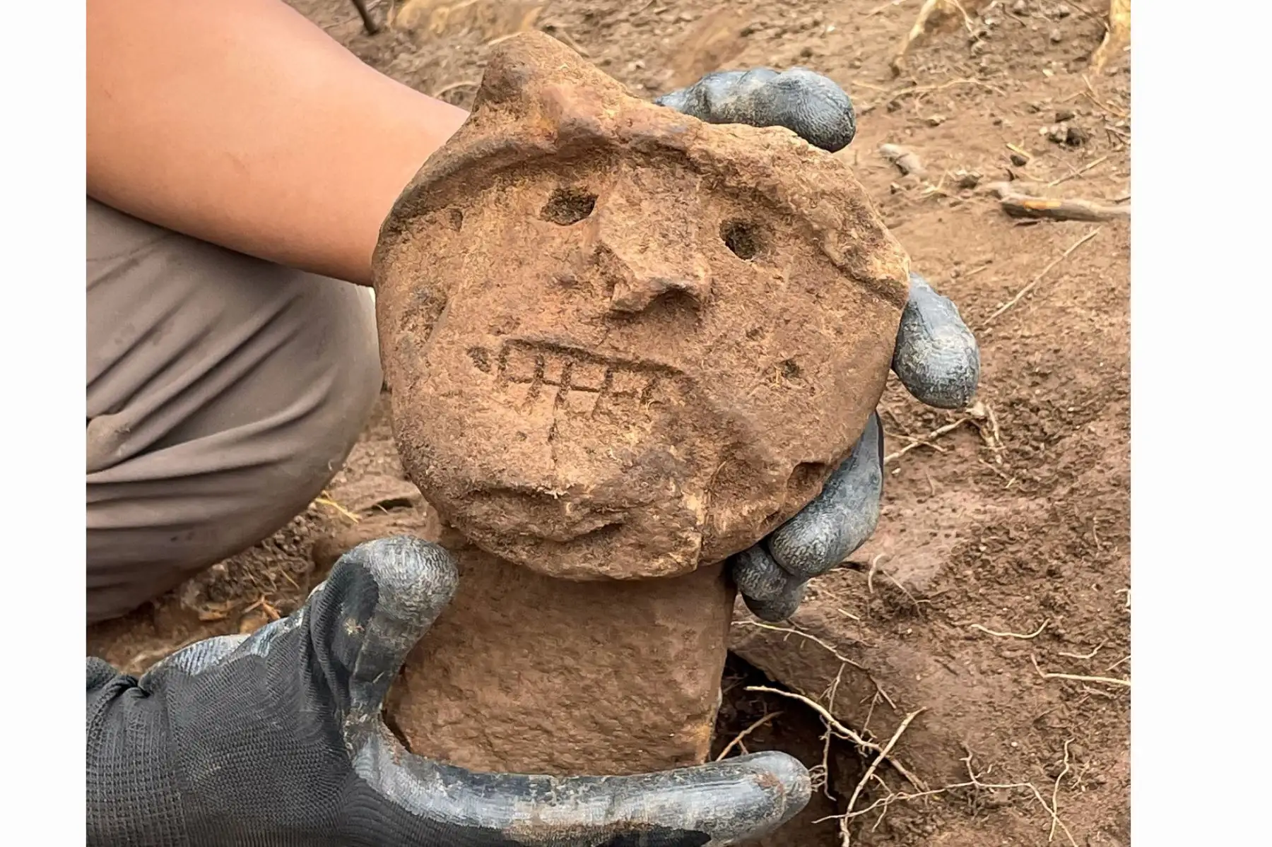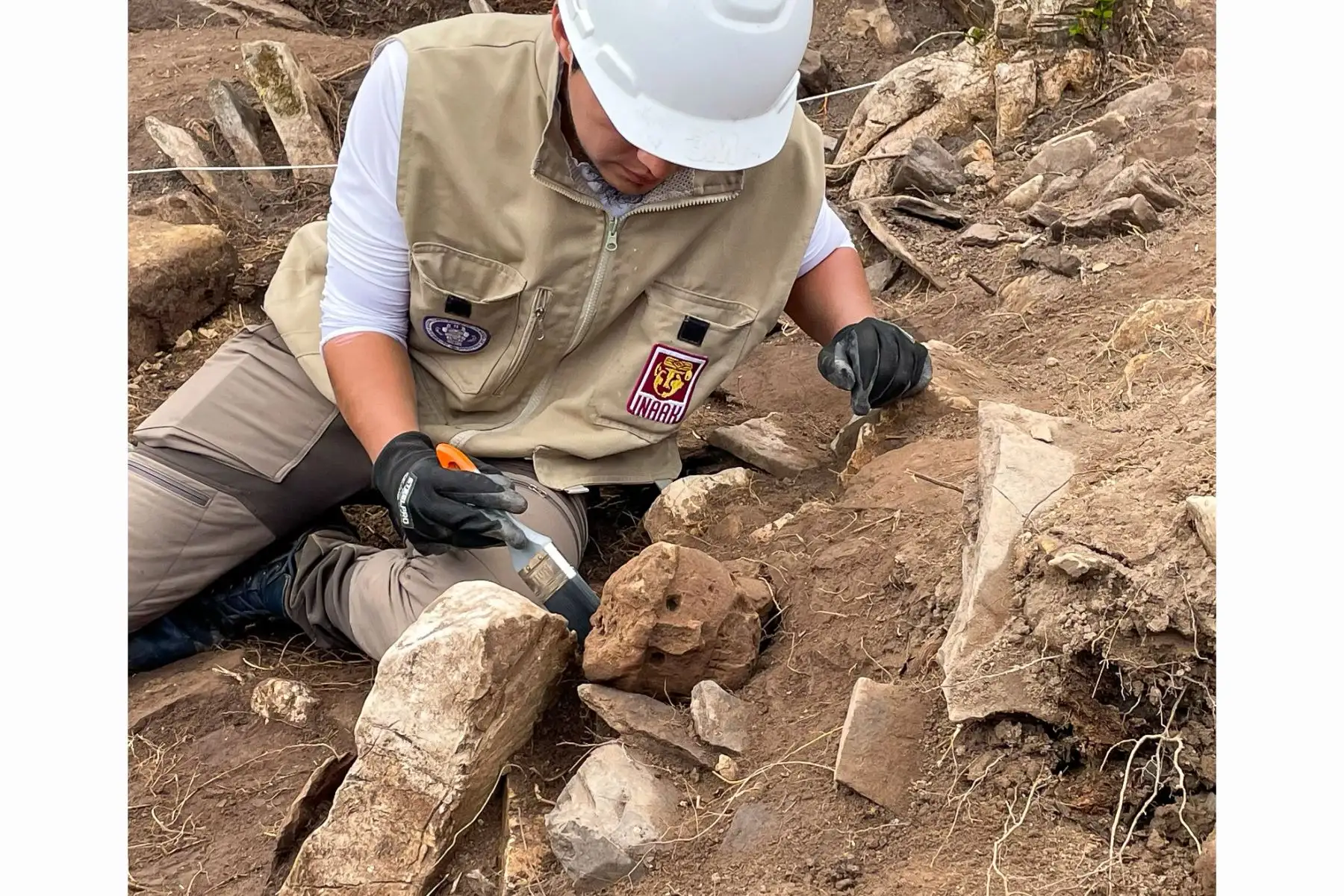 05/08/2025 Los hallazgos más destacados corresponden a dos cabezas clavas, recuperadas entre los escombros de los muros perimetrales de una estructura circular; por su orientación y posición, se determinó que originalmente habrían sido colocadas en la parte externa de dicha estructura. Foto: Instituto de Investigación de Arqueología y Antropología “Kuélap” (INAAK) de la UNTRM