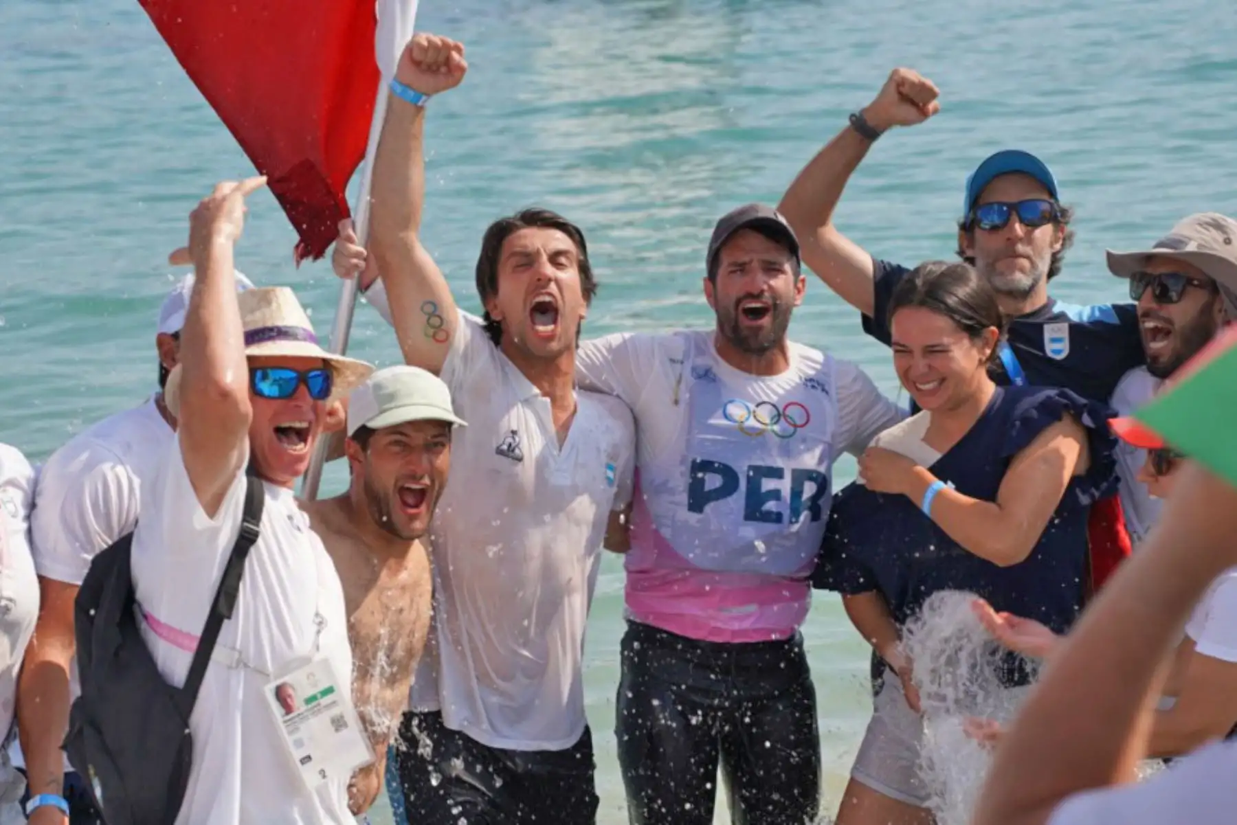 07/08/2025 Stefano Peschiera celebra con la bandera peruana tras conquistar la medalla olímpica de bronce en vela, modalidad dinghy masculino, al ocupar el tercer lugar en la clasificación general en los Juegos Olímpicos de París 2024, en la competencia disputada en Marsella. Foto: Team Perú