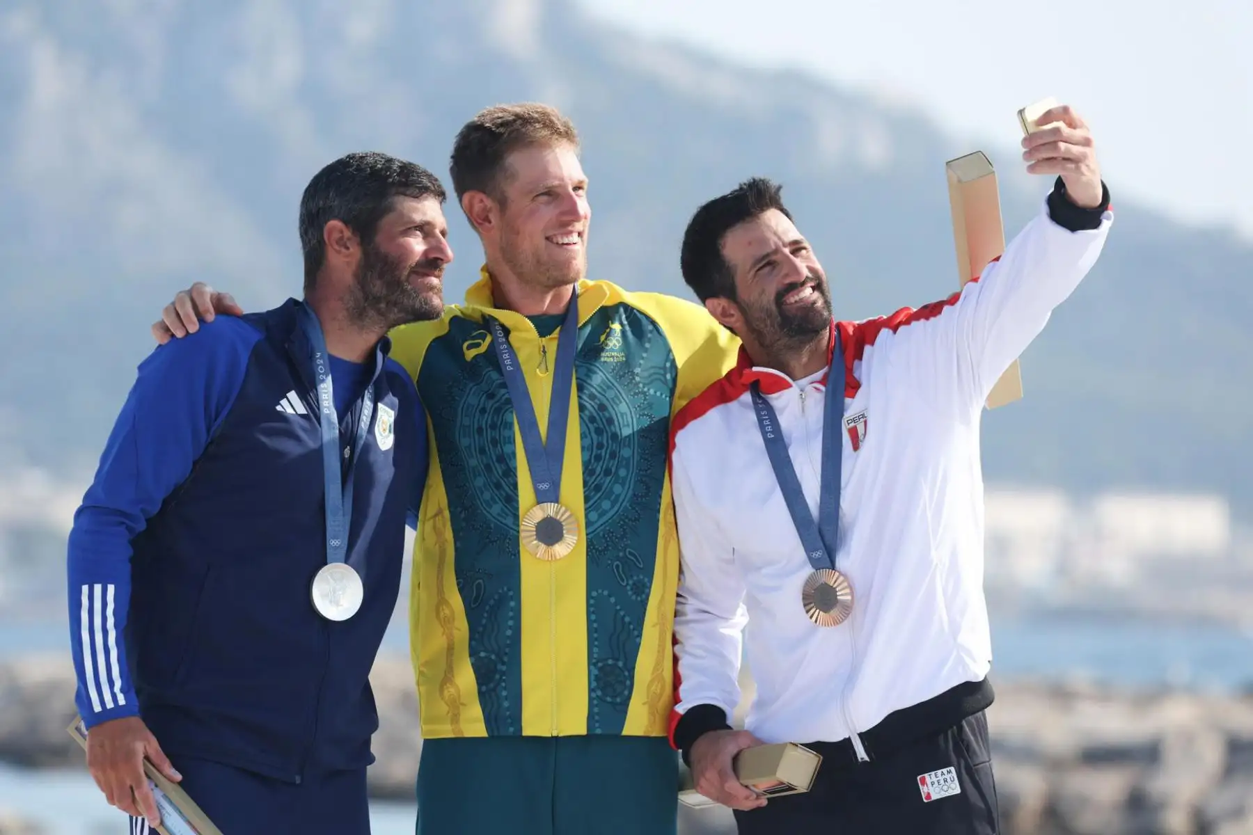 07/08/2025 El medallista de plata Pavlos Kontides de Chipre, el medallista de oro Matt Wearn de Australia y el medallista de bronce Stefano Peschiera de Perú durante la ceremonia de entrega de medallas para el evento de vela ligera masculina de las competiciones de vela en los Juegos Olímpicos de París 2024, en la Marina de Marsella. Foto: AFP