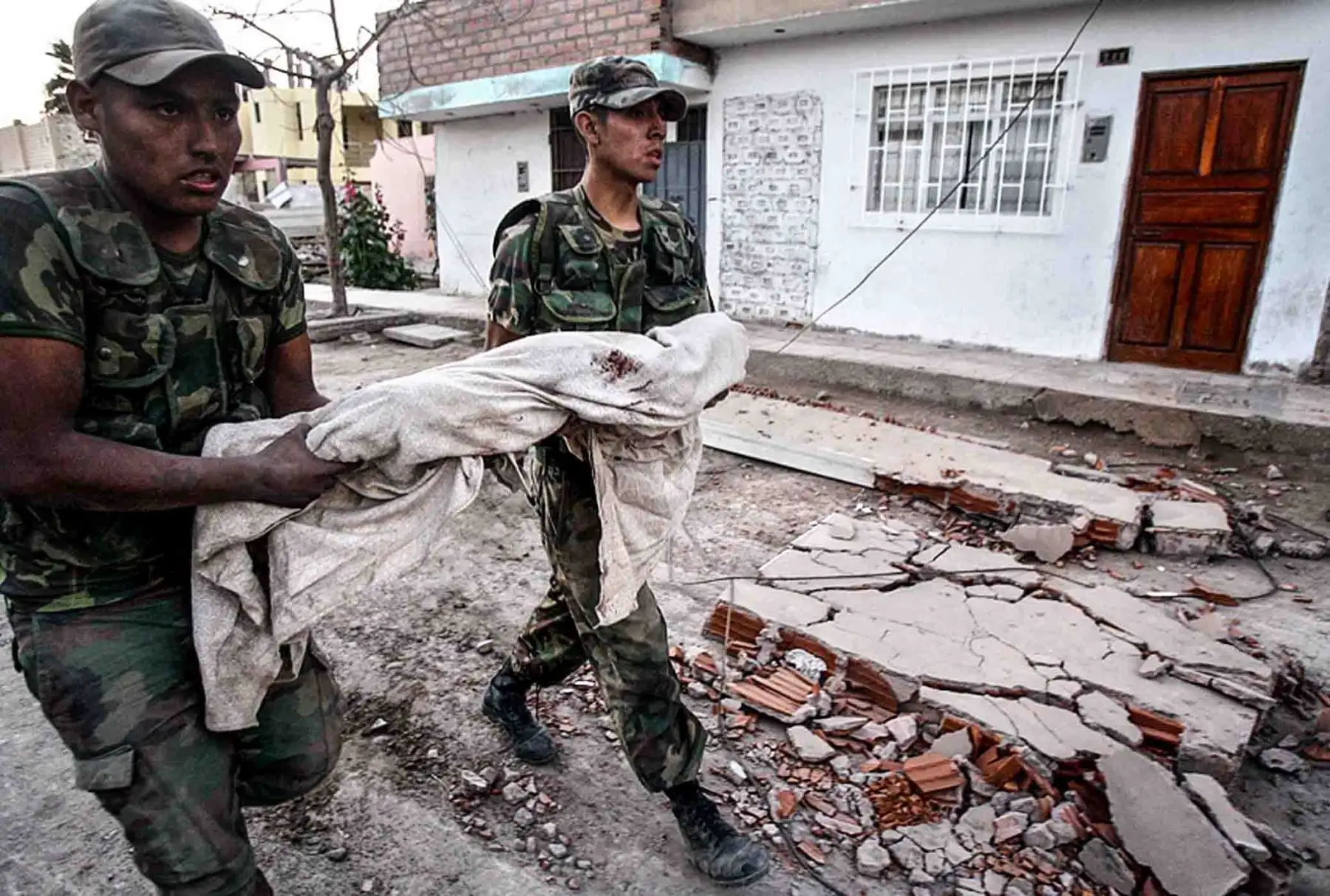 15/08/2025 Dos miembros del Ejército trasladan el cuerpo de un infante fallecido en la ciudad de Pisco (16 de agosto del 2007). Foto:ANDINA/ Carlos Américo Lezama Villantoy