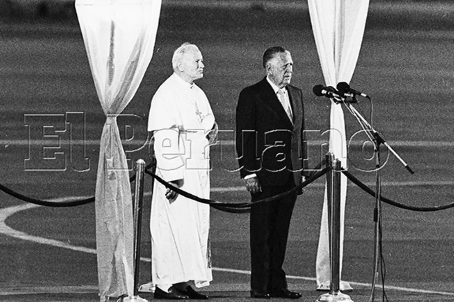 07/10/2025 Callao - 1 feb 1985 / El presidente Fernando Belaunde Terry y el cardenal Juan Landázuri Rickets dan la bienvenida a su Santidad el Papa Juan Pablo II a su llegada al Perú en el Grupo Aéreo n° 8. Foto: Archivo Histórico El Peruano