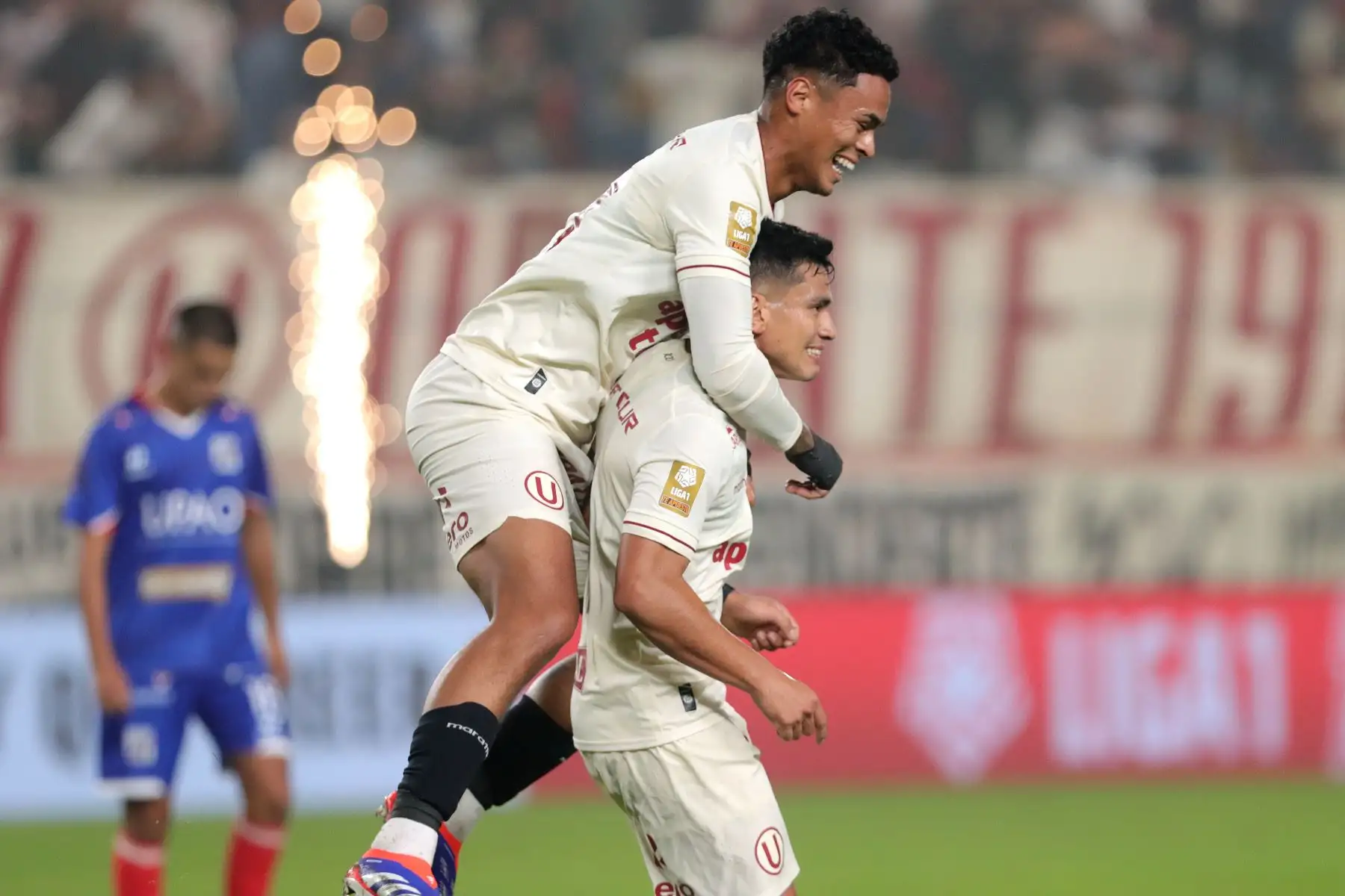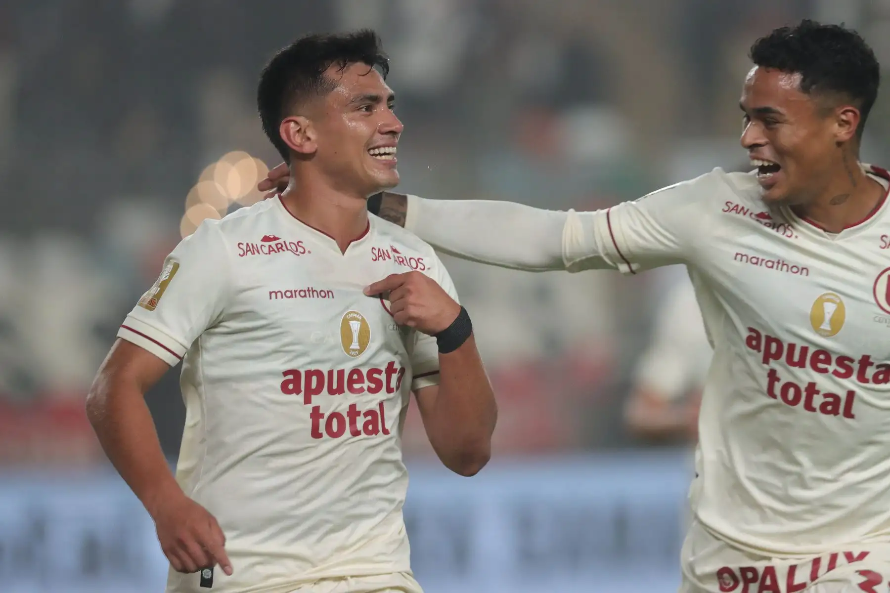 14/07/2024 Universitario de Deportes juega ante Mannucci durante el primer partido del Torneo Clausura 2024 en el Estadio Monumental. En la imagen, el jugador de Universitario, Edison Flores y Alex Valera celebran un gol.