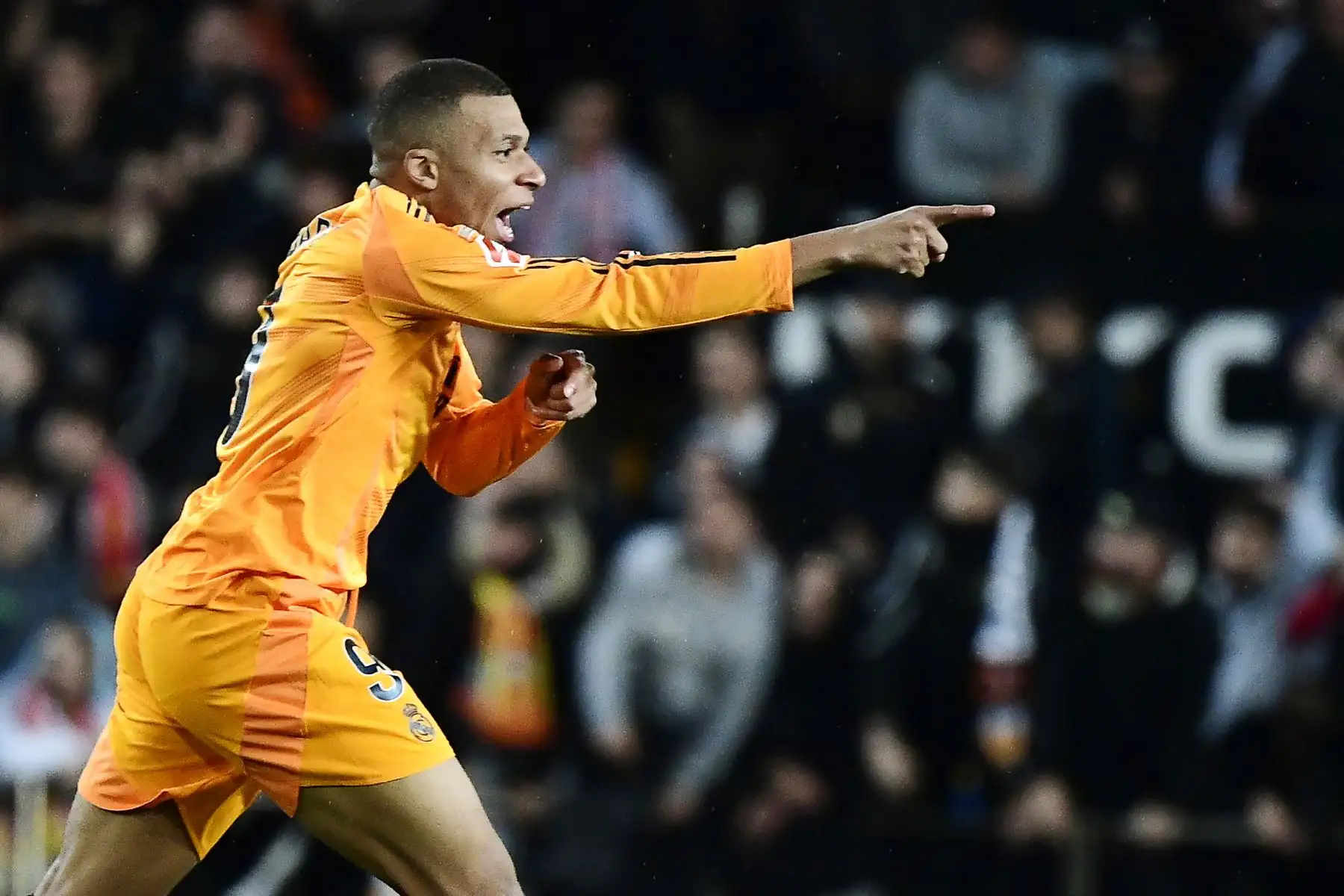 03/01/2025 El delantero francés del Real Madrid, Kylian Mbappé, celebra después de marcar un gol, que luego fue anulado por fuera de juego, durante el partido de fútbol de la liga española entre el Valencia CF y el Real Madrid CF en el estadio de Mestalla en Valencia. Foto: ANDINA/AFP