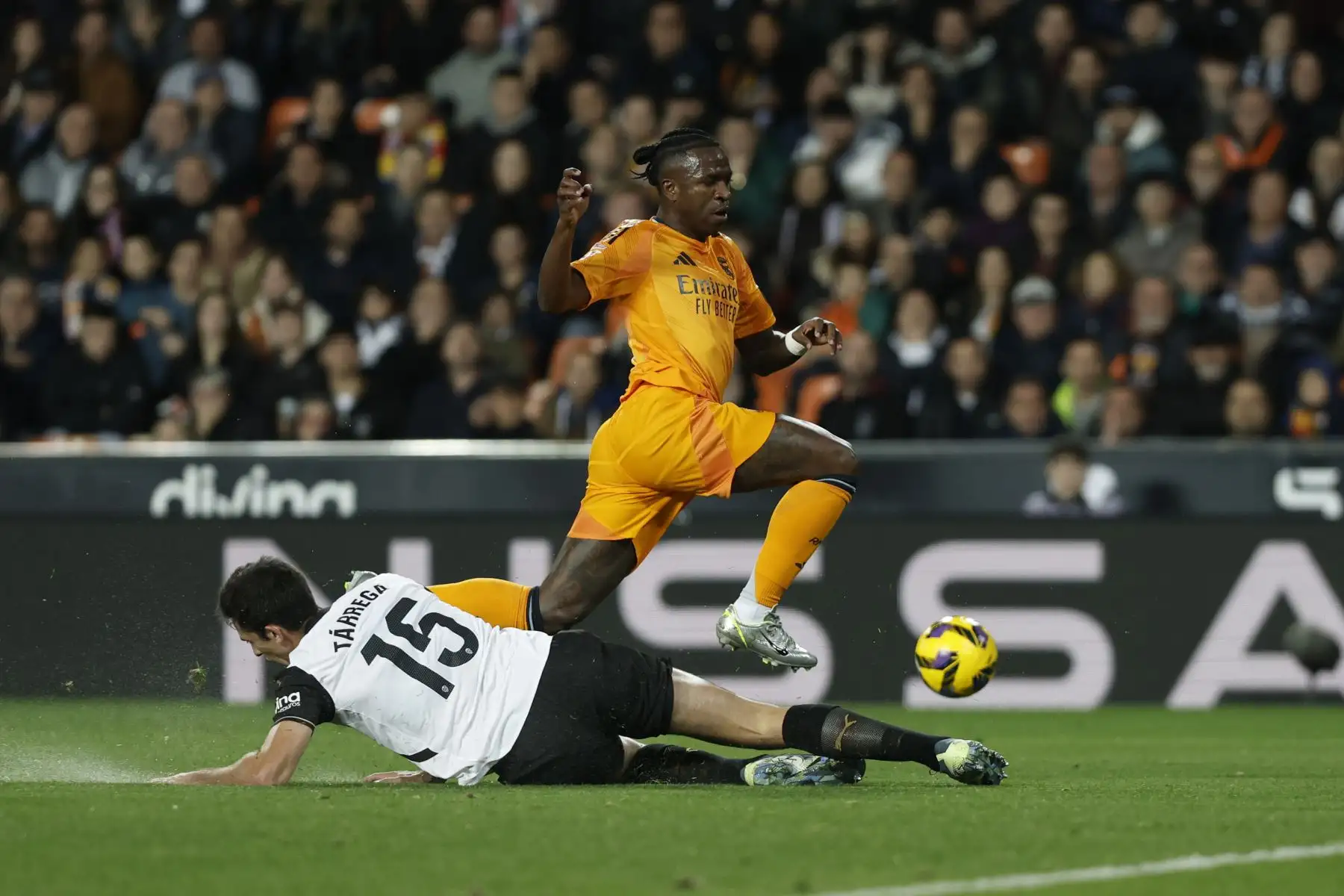 03/01/2025 El delantero brasileño del Real Madrid Vinicius Jr. se escapa de César Tárrega, del Valencia CF, durante el partido de la jornada 12 de LaLiga que Valencia CF y el Real Madrid disputan hoy viernes en el estadio de Mestalla, en Valencia. Foto: ANDINA/ EFE