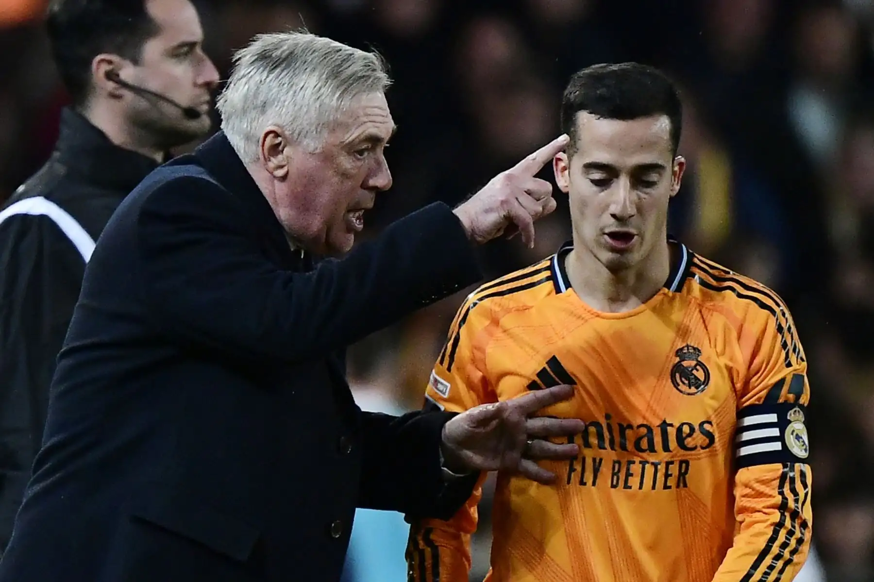 03/01/2025 El entrenador italiano del Real Madrid, Carlo Ancelotti, da instrucciones al defensa español del Real Madrid, Lucas Vázquez, durante el partido de fútbol de la liga española entre el Valencia CF y el Real Madrid CF en el estadio de Mestalla en Valencia. Foto: ANDINA/AFP