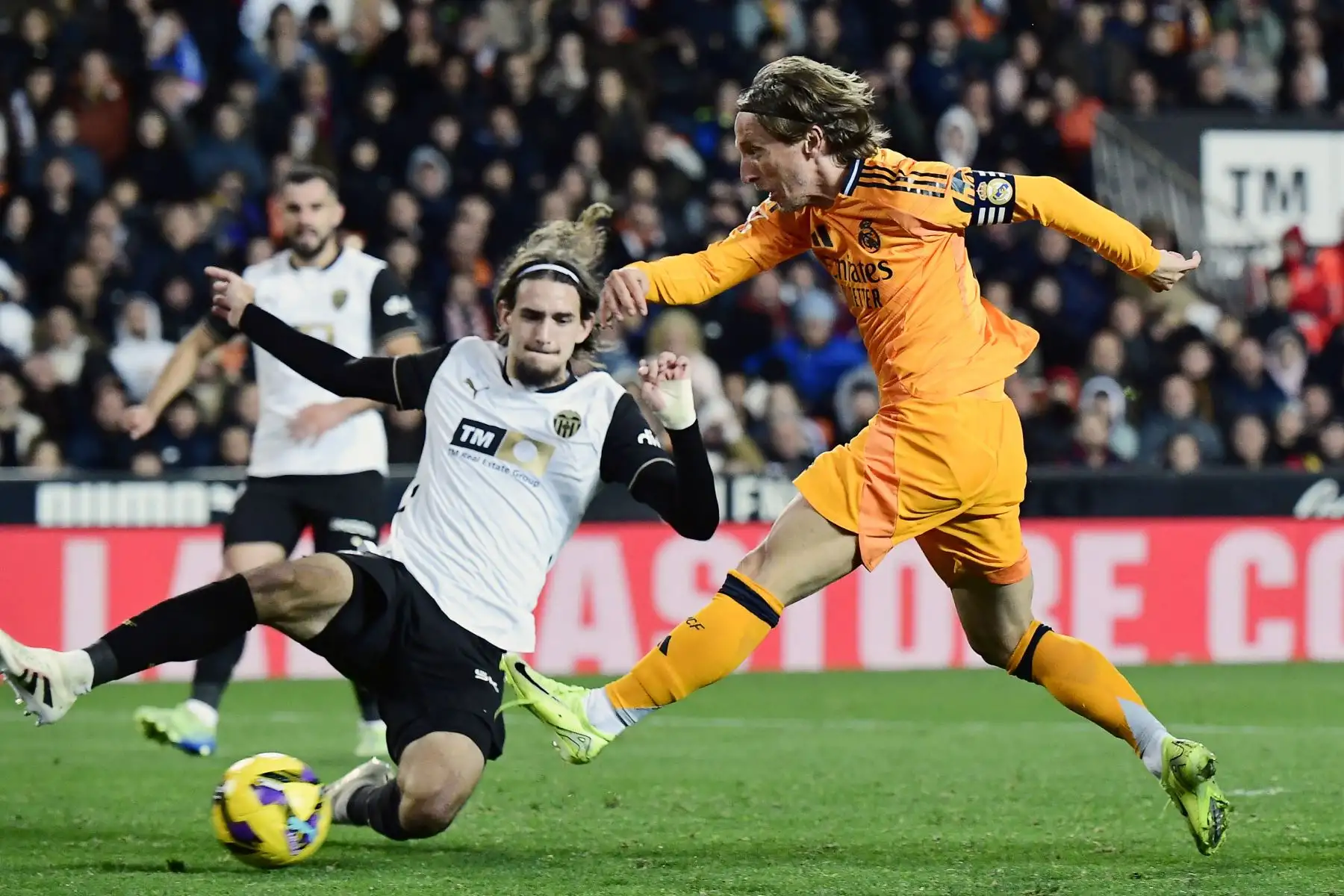 03/01/2025 El centrocampista croata del Real Madrid, Luka Modric , dispara para marcar un gol durante el partido de fútbol de la liga española entre el Valencia CF y el Real Madrid CF en el estadio Mestalla en Valencia. Foto : ANDINA/AFP