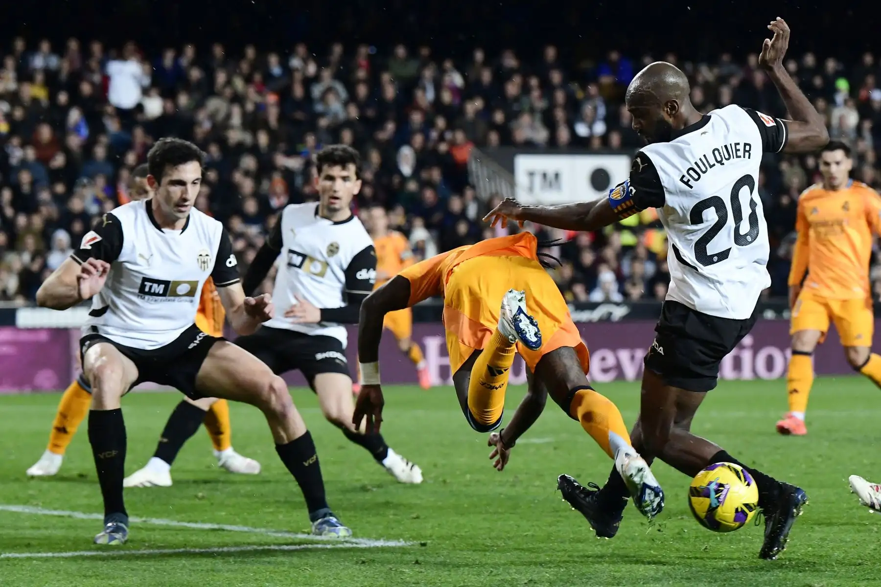 03/01/2025 El defensa francés del Valencia, Dimitri Foulquier , desafía al delantero brasileño del Real Madrid, Vinicius Junior, durante el partido de fútbol de la liga española entre el Valencia CF y el Real Madrid CF en el estadio de Mestalla en Valencia. Foto: ANDINA/AFP