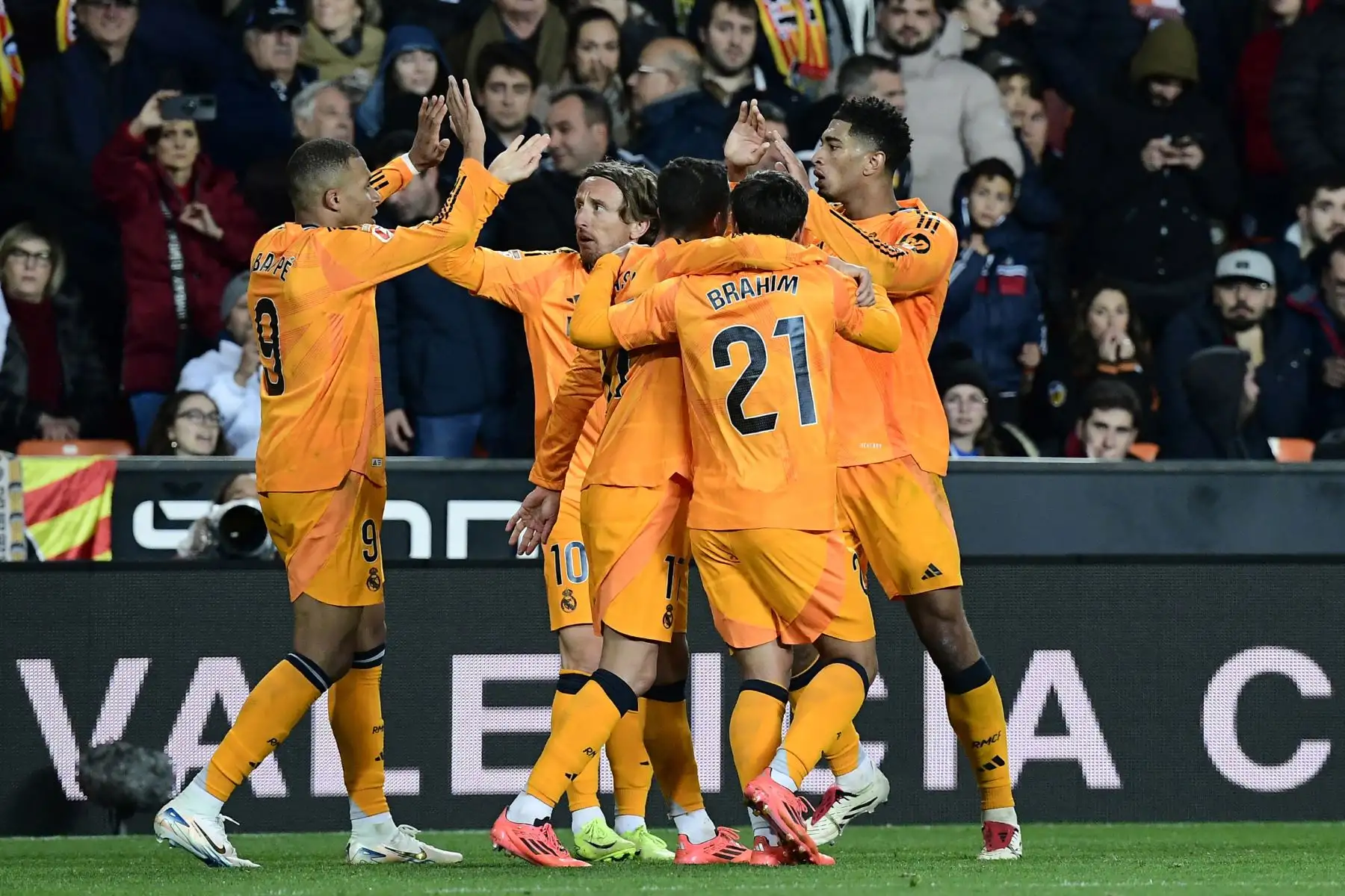 03/01/2025 El centrocampista inglés del Real Madrid Jude Bellingham celebra con sus compañeros de equipo después de anotar el segundo gol de su equipo durante el partido de fútbol de la liga española entre Valencia CF y Real Madrid CF en el estadio de Mestalla en Valencia. Foto: ANDINA/AFP