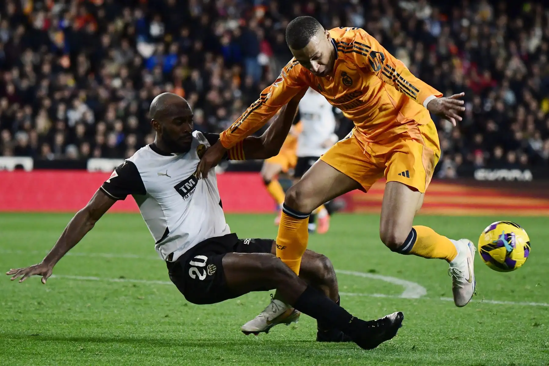 03/01/2025 El defensa francés del Valencia, Dimitri Foulquier, desafía al delantero francés del Real Madrid, Kylian Mbappé, durante el partido de fútbol de la liga española entre el Valencia CF y el Real Madrid CF en el estadio Mestalla en Valencia. Foto: ANDINA/ AFP