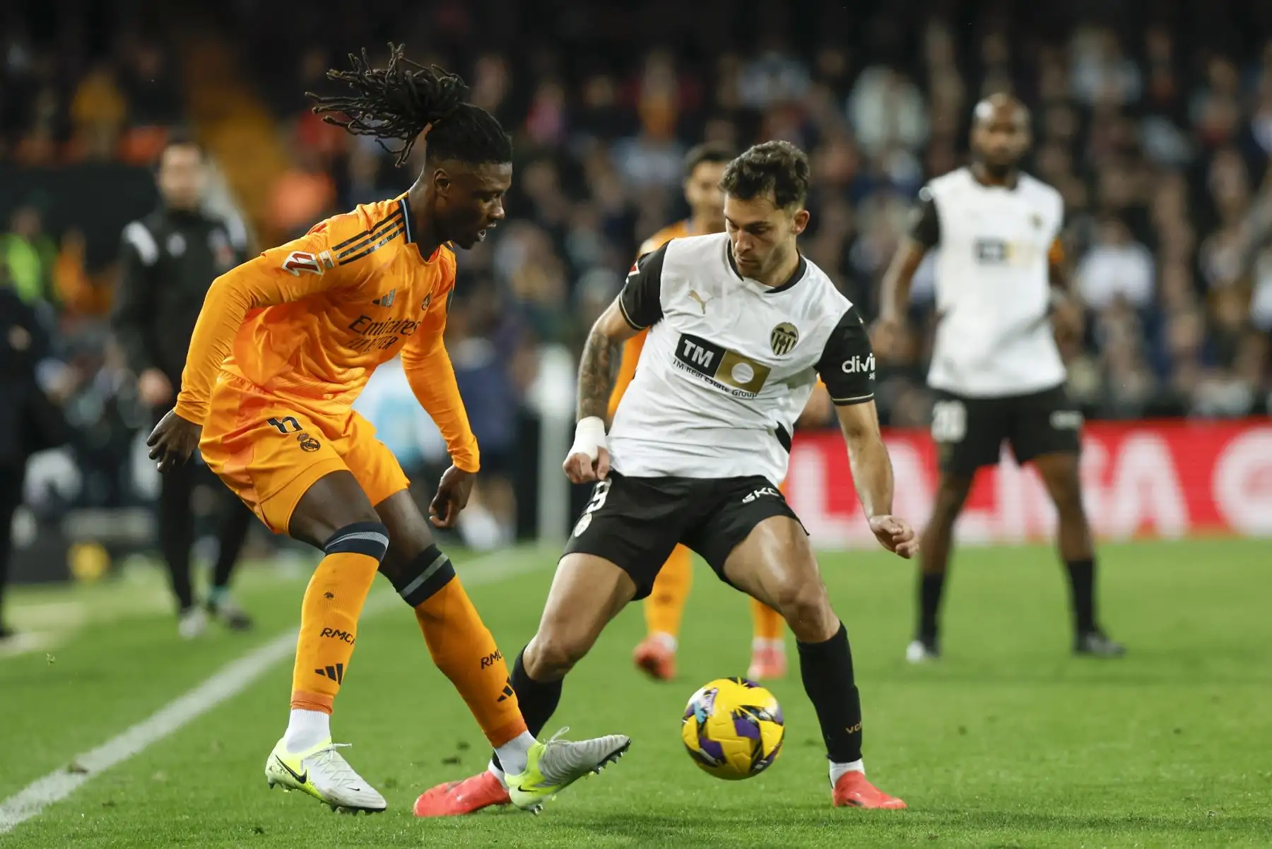 03/01/2025 El centrocampista del Real Madrid Eduardo Camavinga lucha con Hugo Duro, del Valencia, durante el partido de la jornada 12 de LaLiga que Valencia CF y el Real Madrid disputan hoy viernes en el estadio de Mestalla, en Valencia.