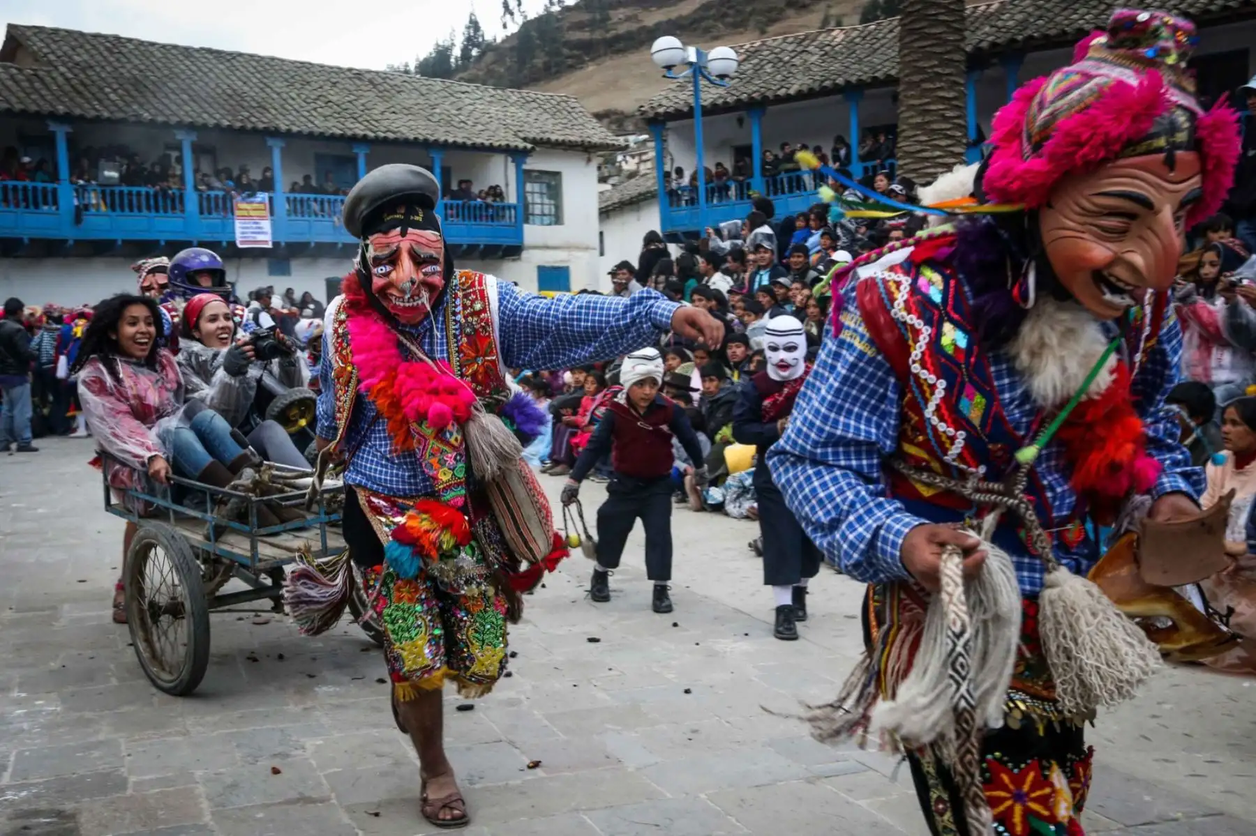 12/07/2024 Maqta. Es un personaje que representa al campesino, son los bufones de la fiesta en honor a la Virgen del Carmen que se encargan de hacer bromas y diálogos picarescos con el público. Su vestimenta consta de un vistoso chullo, una máscara de yeso de expresión alegre, chaleco multicolor, camisa blanca, chuspa, pantalón negro de bayeta hasta la rodilla, ojotas y látigo de soguilla de lana.. Foto: ANDINA/ Carlos Lezama Villantoy