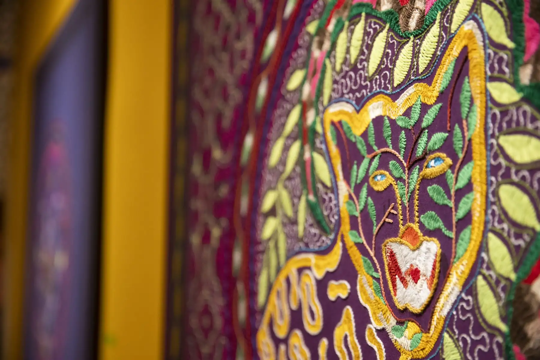 15/09/2022 Sobre el ala derecha de la galería están los trabajos de la maestra shipibo-konibo Olinda Silvano, residente en la comunidad de Cantagallo. Su trabajo en yute, a la vez, es colectivo: involucra a los ayudantes que colaboran con ella en los distintos procesos como el zurcido, el teñido, bordado y pintado. Foto: ANDINA/Carla Patiño