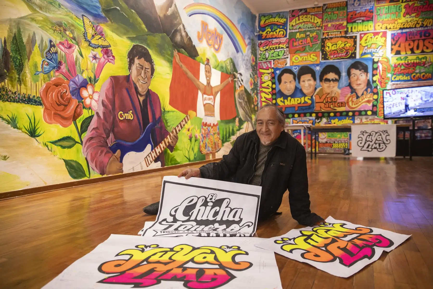 15/09/2022 ‘Monky’ Rojas revolucionó a inicios de los ochenta los carteles chicha, que hoy son reconocidos en el ámbito internacional. Exposición "Yuyay Lima" en la Galeria Pancho Fierro del Centro de Lima. Foto: ANDINA/Carla Patiño