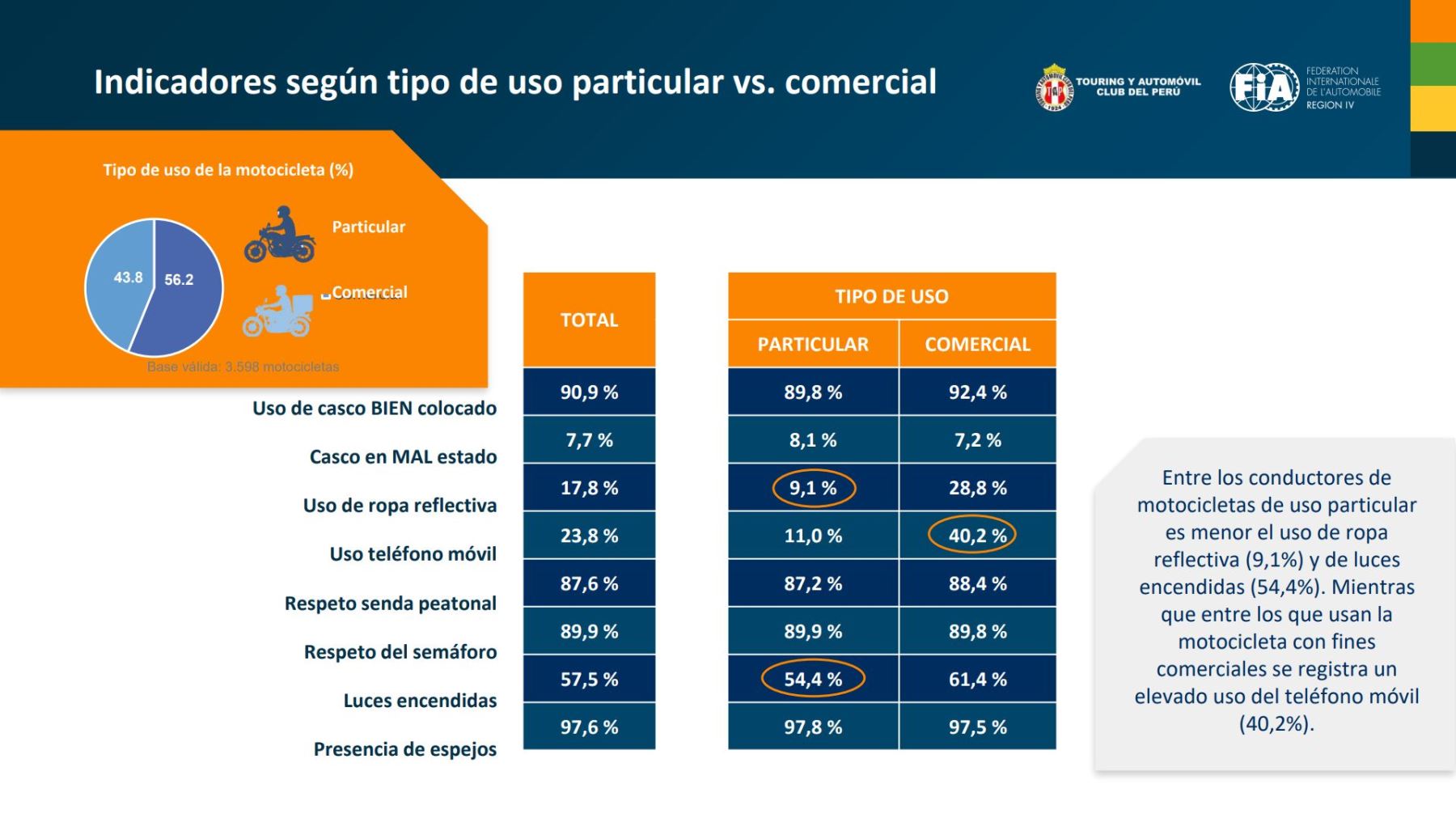 En una ciudad en que alrededor del 40 % de las motocicletas que circulan en Lima se emplean para usos comerciales, estos hallazgos son un llamado de atención para las autoridades que deben afinar las labores de fiscalización para corregir conductas que exponen al peligro a los usuarios de las vías y a los peatones.