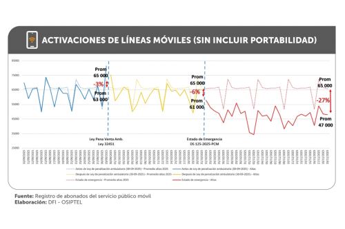 Agregó que, la declaratoria del estado de emergencia, el 21 de octubre, el efecto de la Ley n° 32451, el trabajo regulatorio y de fiscalización, así como el despliegue multisectorial de acciones en materia de seguridad ciudadana, han impactado estadísticamente de manera importante en las nuevas activaciones de líneas móviles.