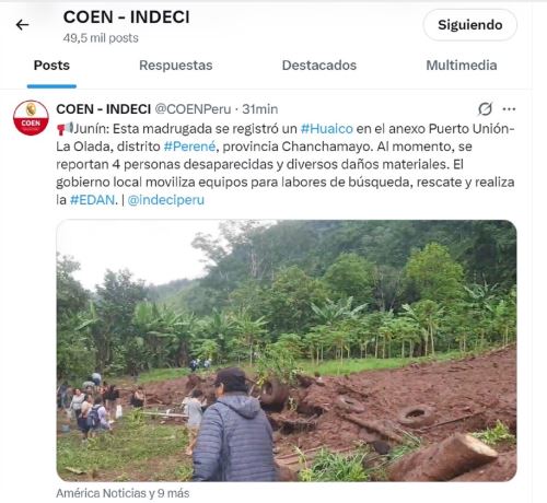 Por último, el Centro de Operaciones de Emergencia Nacional (COEN) informó que en la madrugada de hoy se registró un huaico en el anexo Puerto Unión-La Olada, ubicado en el distrito de Perené.