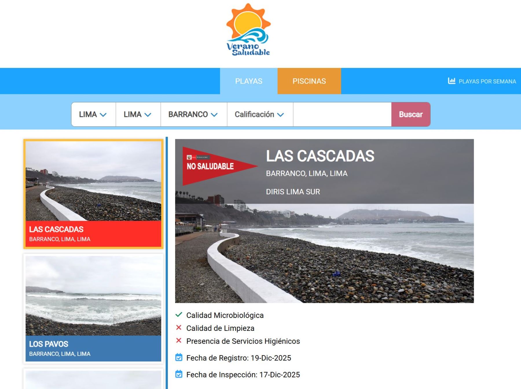 Verano Saludable que contiene información actualizada en base a las inspecciones que efectúan las autoridades regionales de salud. La evaluación se realiza en función a tres criterios: calidad del agua, limpieza y disponibilidad de servicios higiénicos.