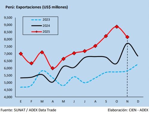 “Este resultado confirma que las exportaciones lograrían otro récord al cierre del 2025, pues la cifra a noviembre ya superó lo alcanzado en el 2024 (74,664 millones de dólares). Si la tendencia se mantiene, podríamos acercarnos a los 90,000 millones de dólares”, aseveró.