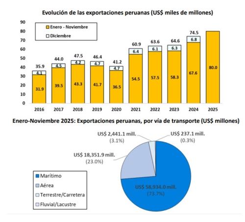 Detalló que los despachos peruanos al mundo registrados entre enero y noviembre del año pasado totalizaron 79,964 millones de dólares, monto que significó un aumento de 18.2% en comparación con el mismo periodo del 2024 (67,631 millones de dólares).