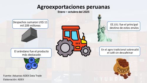 En el 2024 las agroexportaciones peruanas ascendieron a 12,357 millones 818,000 dólares, reflejando un alza de 21.4%. Por su parte, la agroindustria sumó 11,130 millones de dólares y el agro tradicional 1,228 millones de dólares.