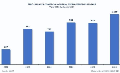 El Midagri destacó que al mes de febrero de este año la balanza comercial agraria registró un superávit de 1,119 millones de dólares, cifra superior en 20.9% en comparación a lo registrado en el mismo periodo del año pasado, y cuyo incremento obedece al mayor incremento en dólares de las expo0rtaciones agrarias (139 millones de aumento respecto al 2025).