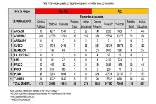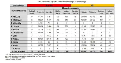 Los departamentos con nivel de riesgo Alto comprenden una población expuesta de 147482 habitantes; 70662 viviendas; 118 establecimientos de salud y 651 instituciones educativas.