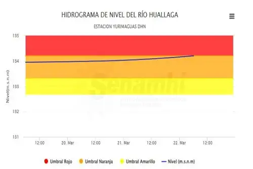 El río Huallaga, en el departamento de Loreto, se ubica en el umbral rojo, al registrar hoy a las 06:00 horas la estación hidrológica Yurimaguas DHN, un nivel de 134.2 metros sobre el nivel del mar, informó el Servicio Nacional de Meteorología e Hidrología (Senamhi), organismo adscrito al Ministerio del Ambiente.