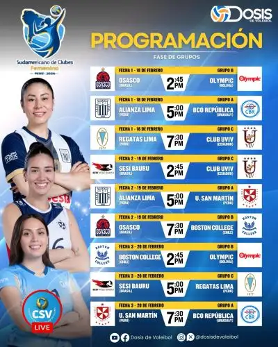 La Confederación Sudamericana de Vóleibol (CSV) hizo oficial este miércoles la programación del Campeonato Sudamericano de Clubes de Vóley, que se disputará del 18 al 22 de febrero, en el Perú.