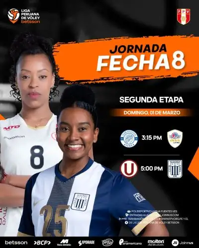 Universitario y Alianza Lima protagonizarán este domingo (17:00 horas) el partido más importante de la octava fecha de la segunda fase de la Liga Peruana de Vóley, encuentro que se jugará en el Polideportivo Lucha Fuentes y que será transmitido por señal abierta a todo Perú.