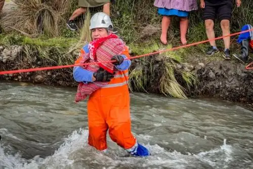 Los rescatistas instalaron un sistema de cuerdas de seguridad y utilizaron cascos, guantes y equipos de protección para permitir el paso de las personas sin que la corriente del río represente un mayor riesgo.