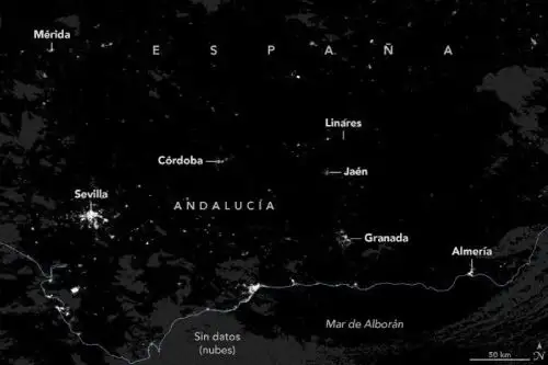 Al analizar los datos del producto Black Marble, Shrestha observó que las luces parecían regresar a la mayoría de las zonas urbanas de la península ibérica para el 29 de abril. Sin embargo, según la investigadora de la NASA, las zonas rurales —especialmente en Andalucía y en las partes al sur y al este de la región de Granada que se muestran en el mapa anterior— seguían a oscuras.
