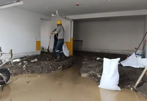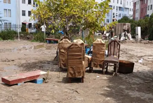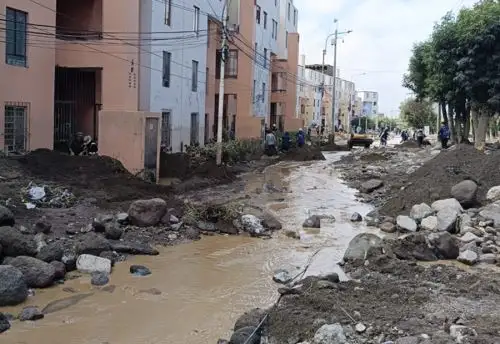 Equipos especializados iniciaron la fumigación y limpieza de los bloques habitacionales Flora Tristán, en Arequipa que fueron inundados tras el desborde de la torrentera Chullo, a consecuencia de las intensas lluvias que soportó