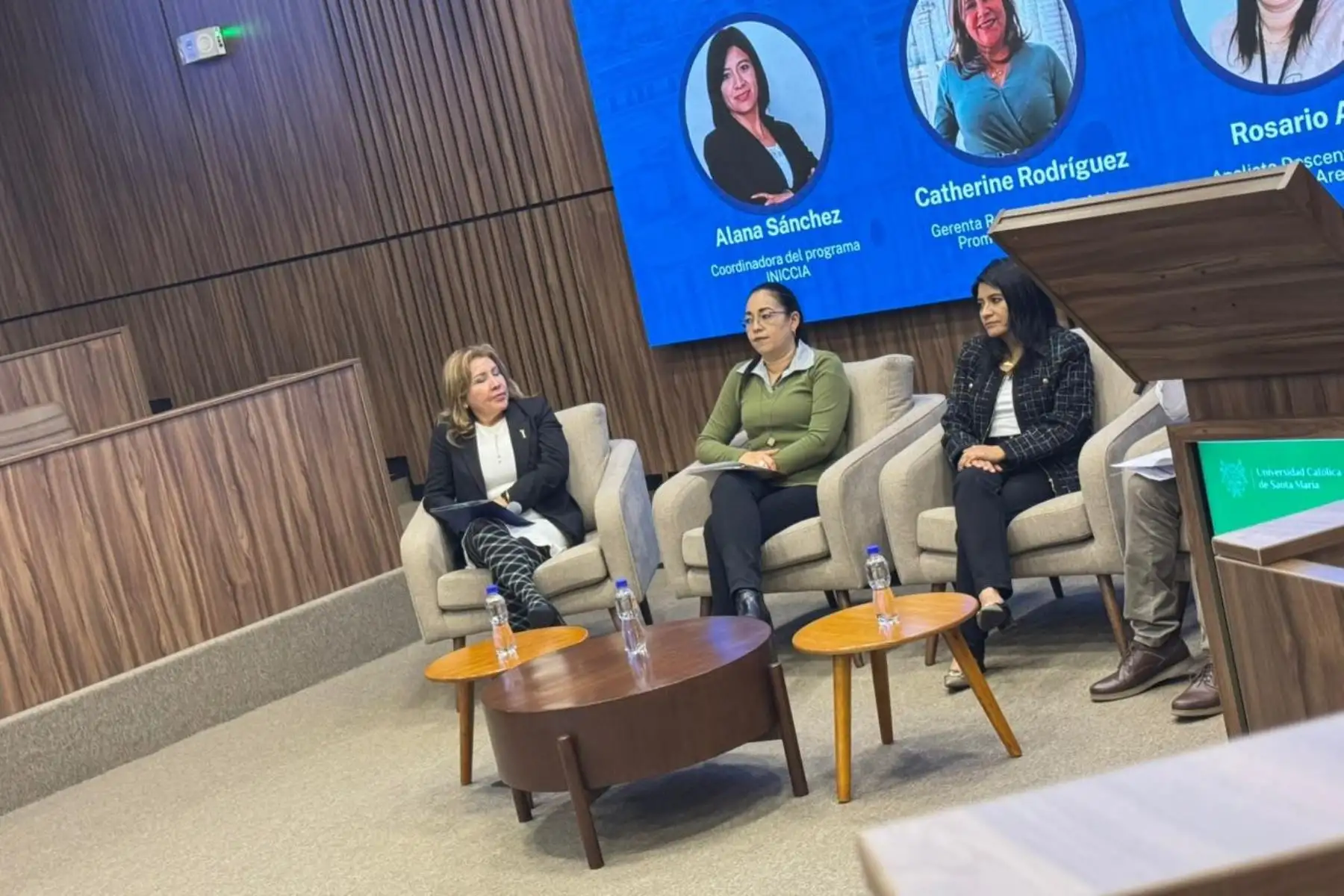 El foro contó con la participación de la gerente del Proyecto Empleo Verde de Techonoserve, Milagros Bernales; la directora de Innovación y Desarrollo de UCSM, Karina Rosas Paredes; y la coordinadora general del Proyecto Venture Studio de Proinnóvate-Innicia, Alana Sánchez Orihuela.