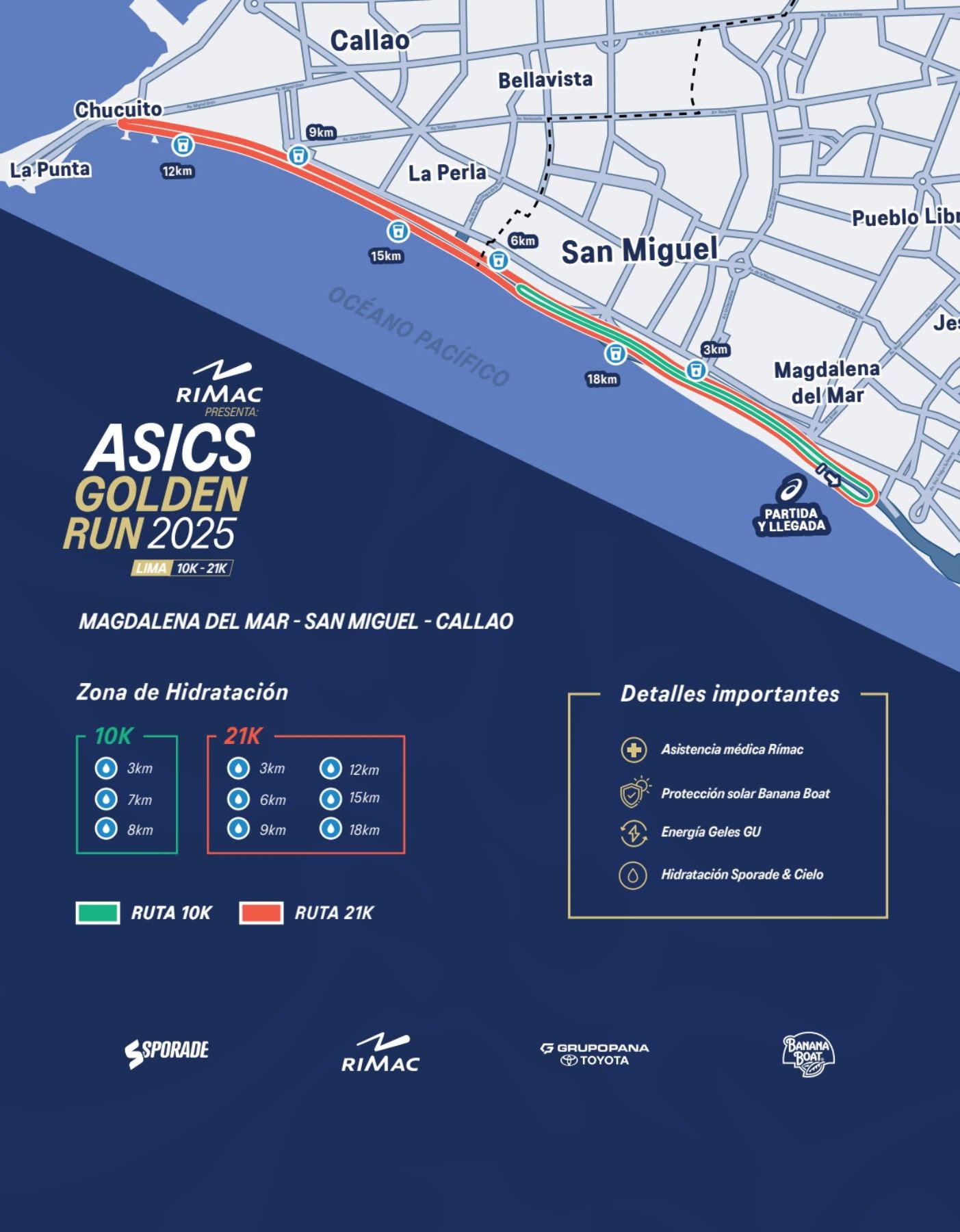 El circuito tendrá como punto de partida y llegada el distrito de Magdalena del Mar. Los participantes del 10K recorrerán la Costa Verde, atravesando los malecones de Magdalena y San Miguel, mientras que los del 21K llegarán hasta La Perla y Chucuito (Callao) antes de retornar a Magdalena.