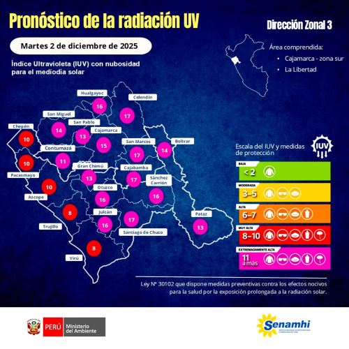 El martes 2 de diciembre, la radiación UV alcanzó valores de 17 en las provincias de Celendín, Cajabamba y San Marcos; 16 en Hualgayoc; 15 en Cajamarca; 14 en San Miguel; 13 en San Pablo; y 11 en Contumazá, todos considerados niveles extremadamente altos.