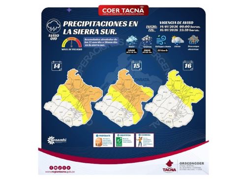 El Servicio Nacional de Meteorología e Hidrología (Senamhi) informó que desde hoy miércoles 14 al viernes 16 de enero se prevé la caída de nieve, granizo, aguanieve y lluvias de moderada a fuerte intensidad en la zona andina de las regiones Tacna y Moquegua.