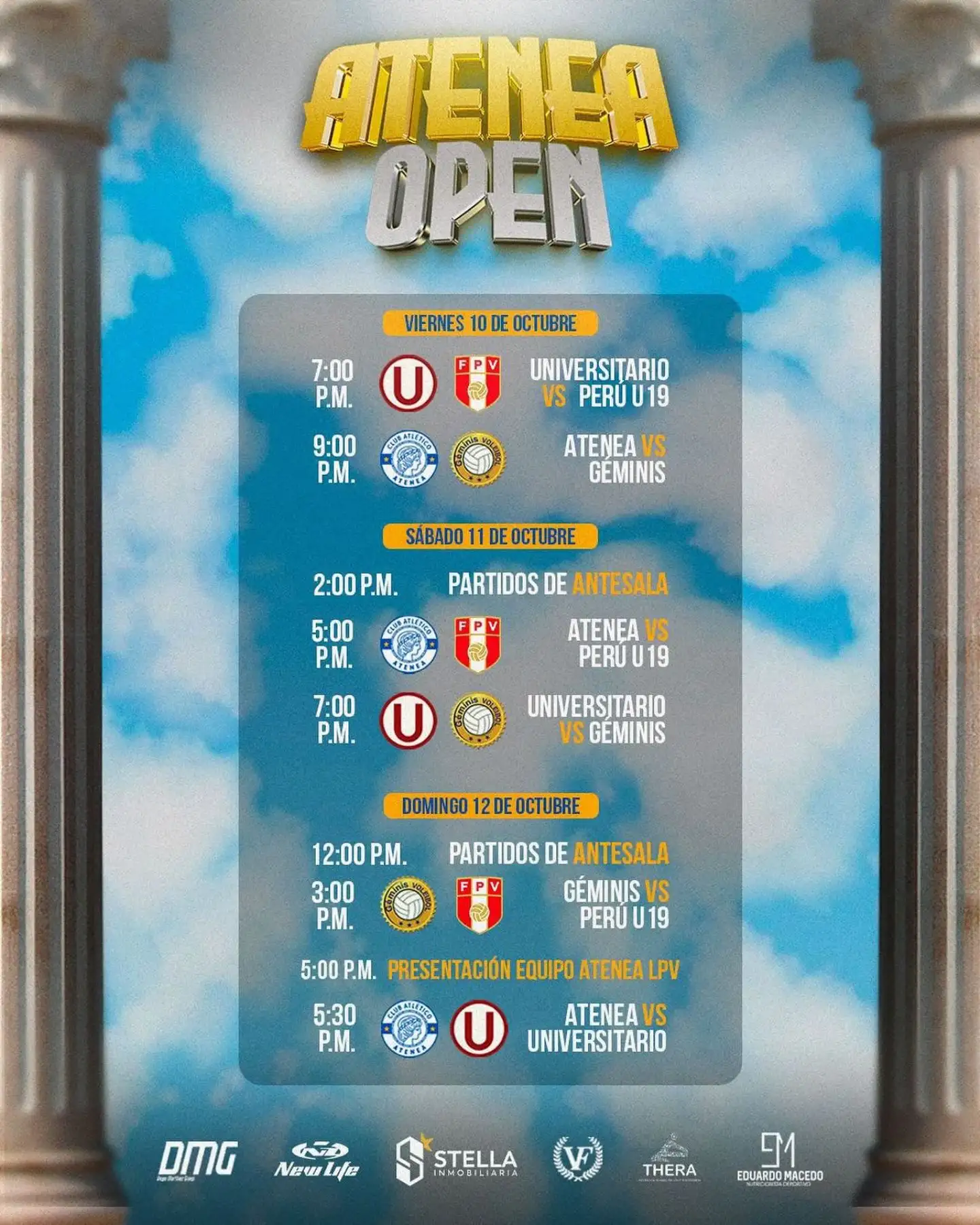 El Atenea Open 2025 marcará el inicio de una nueva temporada para el vóley peruano. Del viernes 10 al domingo 12 de octubre, el Coliseo del Colegio Salesiano será escenario de un atractivo cuadrangular que reunirá a Universitario de Deportes, Deportivo Géminis, el Club Atlético Atenea y la selección peruana Sub-19.