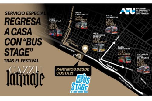 ¡Buena noticia! Una nueva ruta se suma al servicio especial Bus Stage para trasladar a los usuarios hacia Surco y Chorrillos al culminar los eventos “Lima Latin Pop Festival” y “Cazzu Latinaje en vivo” que se realizarán este fin de semana en el multiespacio Costa 21, de la Costa Verde, en San Miguel, anunció la Autoridad de Transporte Urbano para Lima y Callao (ATU).