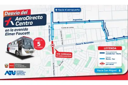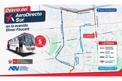 La Autoridad de Transporte Urbano para Lima y Callao (ATU) informa que los servicios Aerodirecto Sur y Centro modificarán su recorrido, desde el domingo 5 de octubre, debido a los trabajos de construcción de la estación Carmen de la Legua de la Línea 4 del Metro.