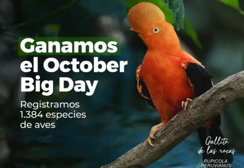 En la edición 2023 del October Big Day, Perú se coronó como el destino privilegiado para la observación de aves en el mundo, al obtener el primer lugar, informó el Servicio Nacional de Áreas Naturales Protegidas por el Estado (Sernanp), organismo adscrito al Ministerio del Ambiente, mientras que en 2024 y 2022 ocupó el segundo lugar detrás de Colombia.