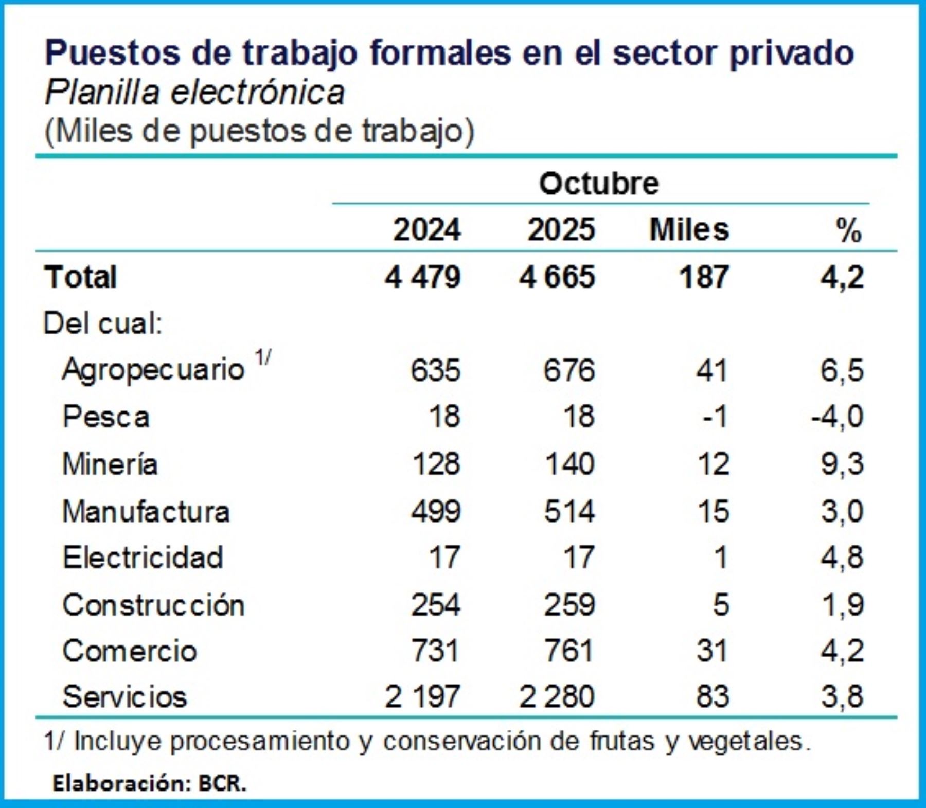 De otro lado, indicó que en el ámbito privado, los puestos de trabajo formales aumentaron 4.2% respecto a octubre del año 2024.