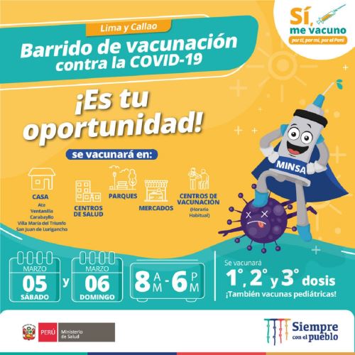 A fin de cerrar las brechas de inmunización en adultos y niños en Lima Metropolitana, el Ministerio de Salud desarrollará este fin de semana su estrategia de barrido de vacunación contra el covid-19, denominada "Es tu oportunidad".
