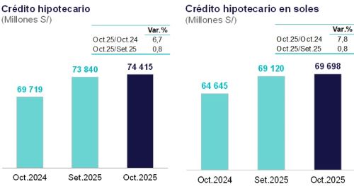 En términos mensuales, precisó, el crédito hipotecario registró un aumento de 0.8% en octubre, impulsado por los préstamos concedidos en soles, los cuales crecieron también un 0.8%.