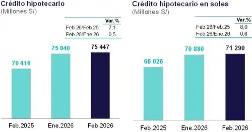 El crecimiento interanual de los créditos hipotecarios registró un ritmo de avance de 7.1% en febrero del 2026, sumando un saldo de 75,447 millones de soles hasta dicho mes, informó el Banco Central de Reserva (BCR).